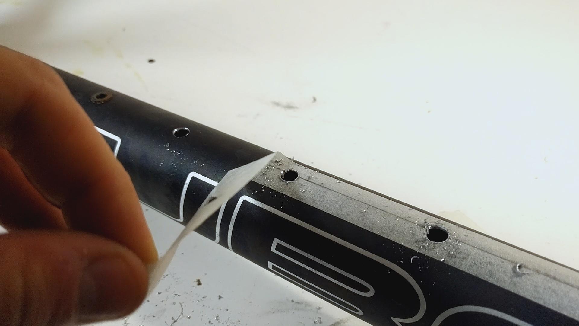 To mount the battery holder to the frame I am using rivnuts. There are two installed in factory, so I need to add three more since I am mounting the battery a bit higher. So I put a piece of tape on the frame and drew a straight line from the existing bottle cage bolt holes. I measured the distance between the centers of the battery holder holes and using a center punch, marked the holes on the frame. Using a drill bit the size of the rivnut, I drilled out where I marked. Take your time getting a straight line across the frame tube because I got mine a bit crooked.