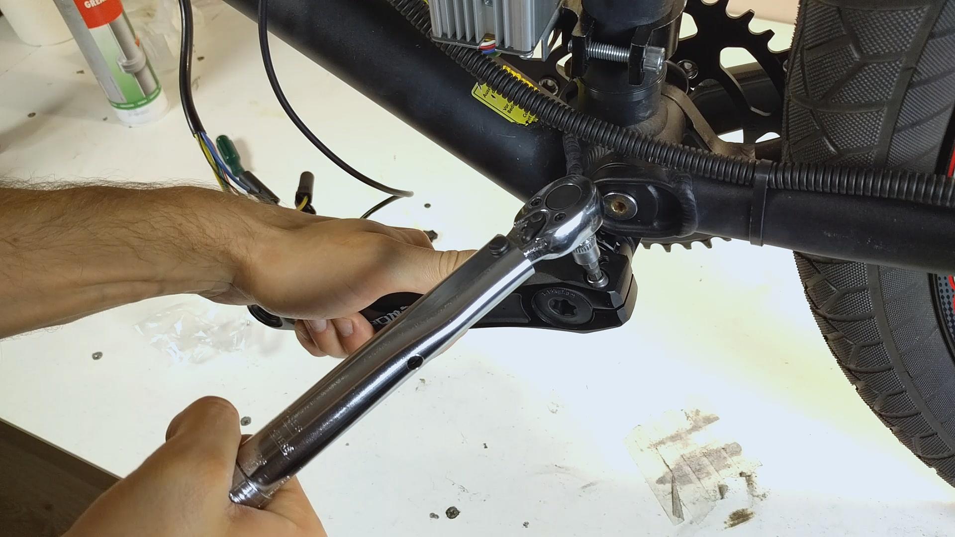 All that now follows is mounting the LCD, throttle, brake levers, switches, a shifter and grips. Note that I used a twist grip shifter on the left side of the handlebars since there is no room next to the throttle. It is put upside down but works just as great and is actually more convenient to use when rotating down to upshift. If you are new in bicycle service go on YouTube and check Park Tool YouTube channel for in depth videos on bicycle component adjusting.
