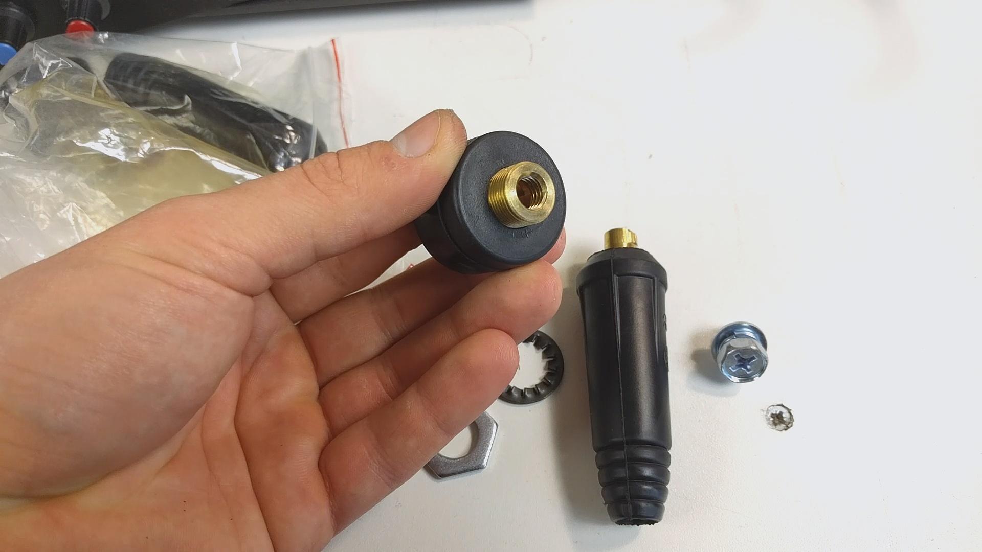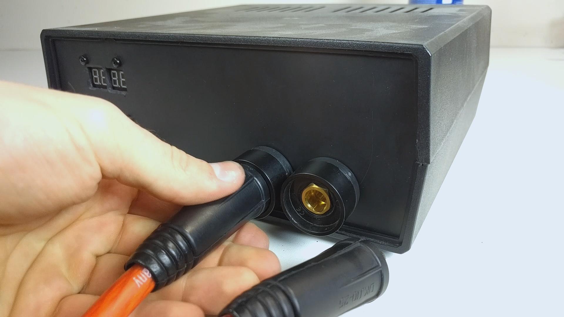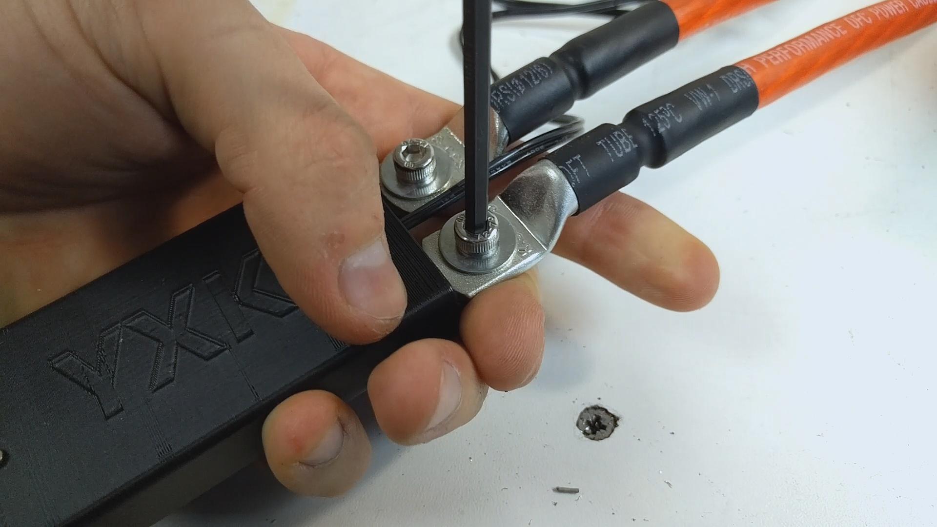 Now that I have the lug nuts on the cable ends, I enlarged the previously made holes in the front panel of the spot welder with a step drill bit to a 14 mm hole. I then mounted the quick connectors to the panel and placed the transformer back in the box. Once the cable lugs are bolted to the quick connectors, I made two cables for the welding pen to connect to. I recommend you use at least a meter of cable for each. To those cables I connected the spot welding pen using the provided bolts.