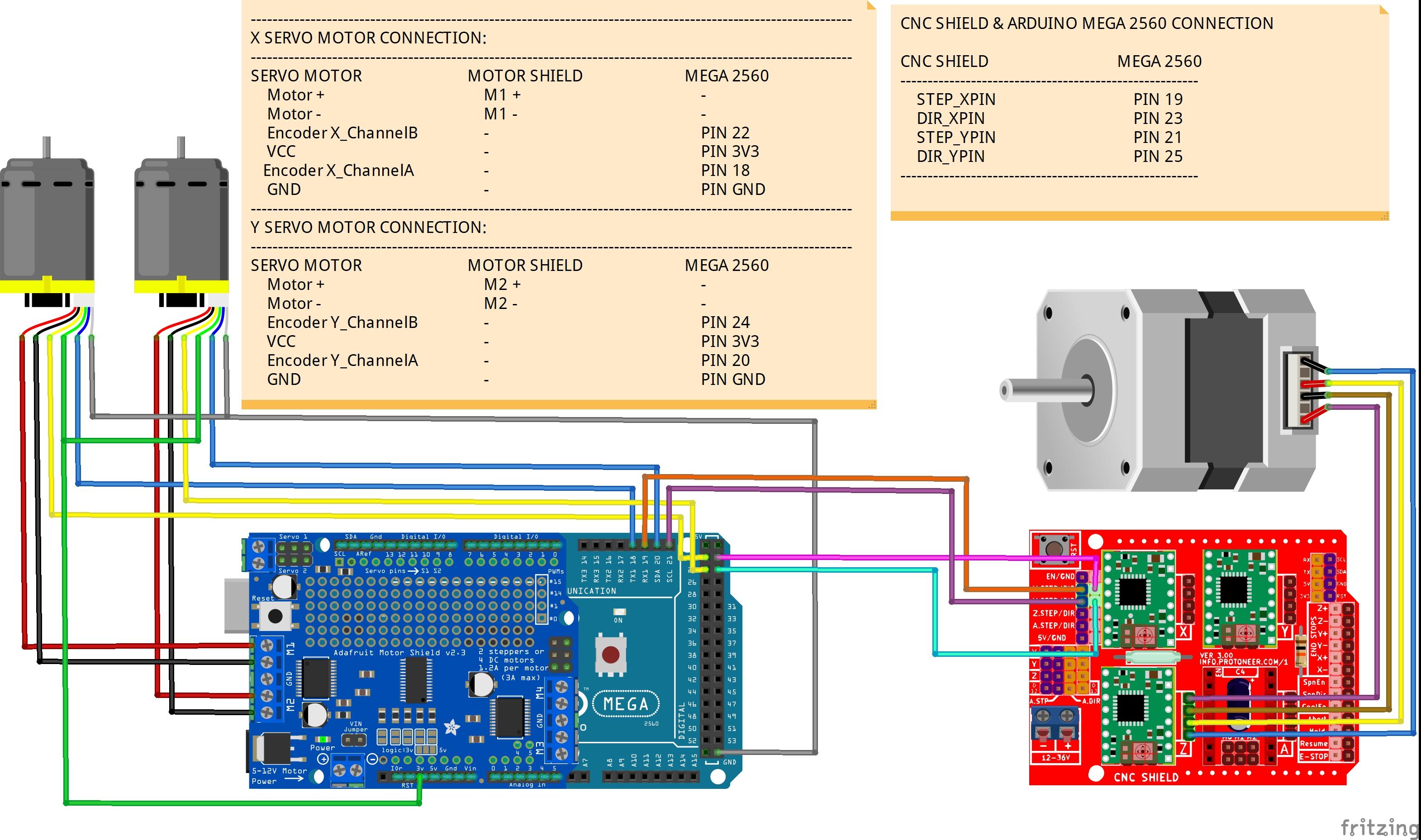 In my project, Arduino Mega 2560 is used just like a DC servo controller. It performs P.I.D control for the X and Y axis DC motors.