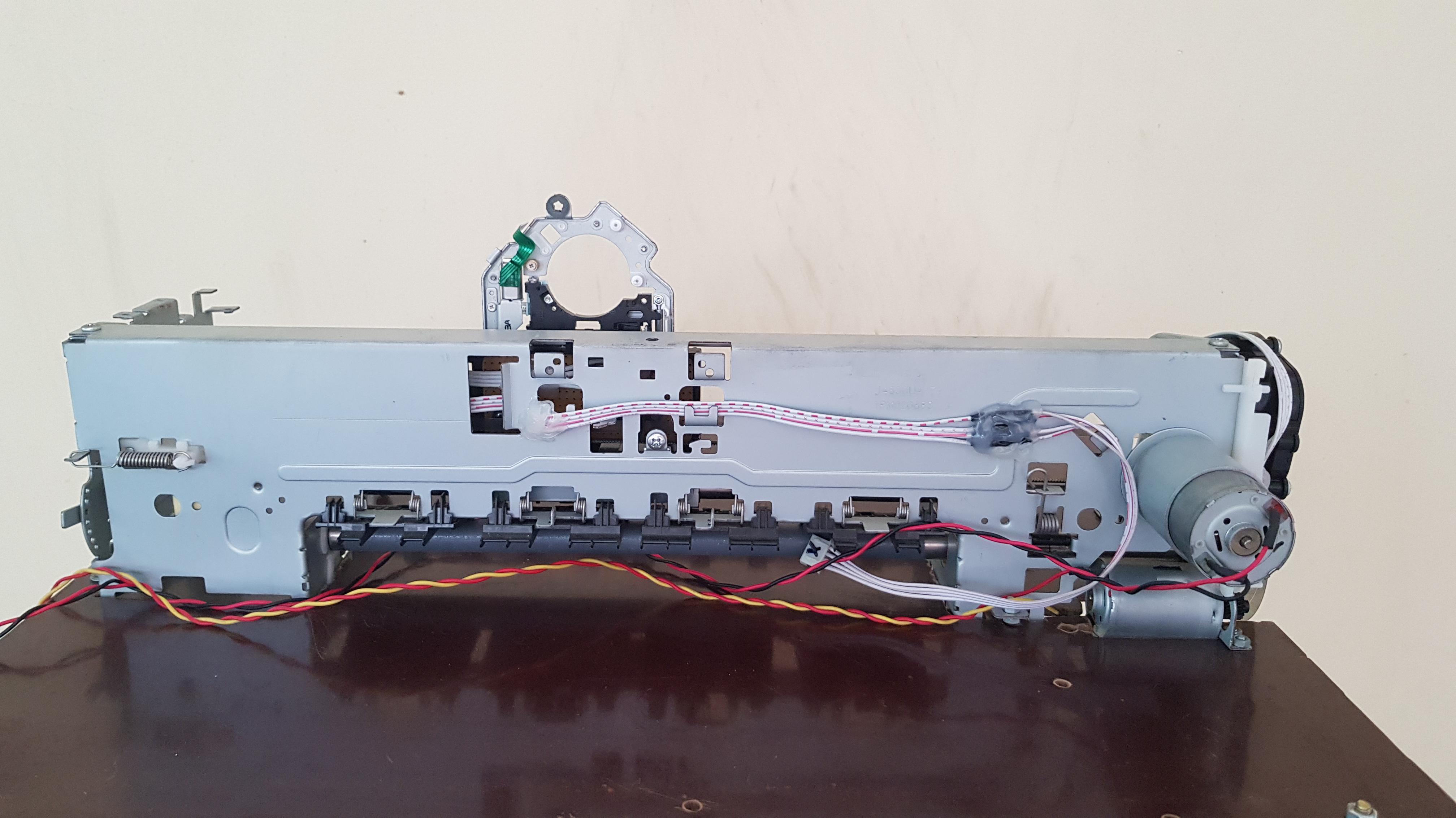 I had one Dell printer that stops working and I disassembled it into small components. This printer head frame has 2 DC motors and 2 optical encoders which are still in good condition & can be reused to build XY axis for the CNC plotter.