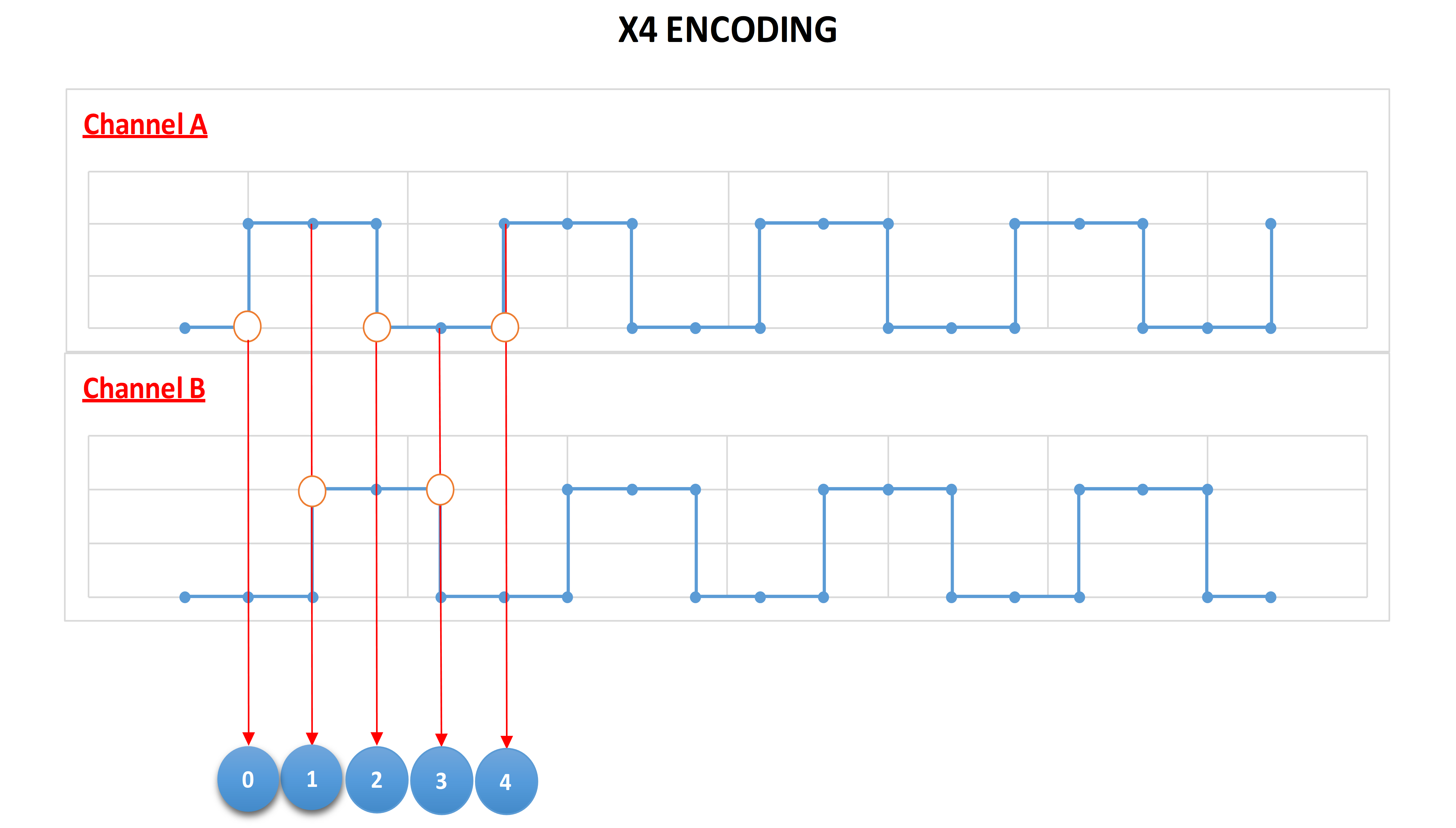 X4 encoding: both the rising and falling edges of channels A and B are counted. When X4 encoding is used, it increases encoder resolution by four times.