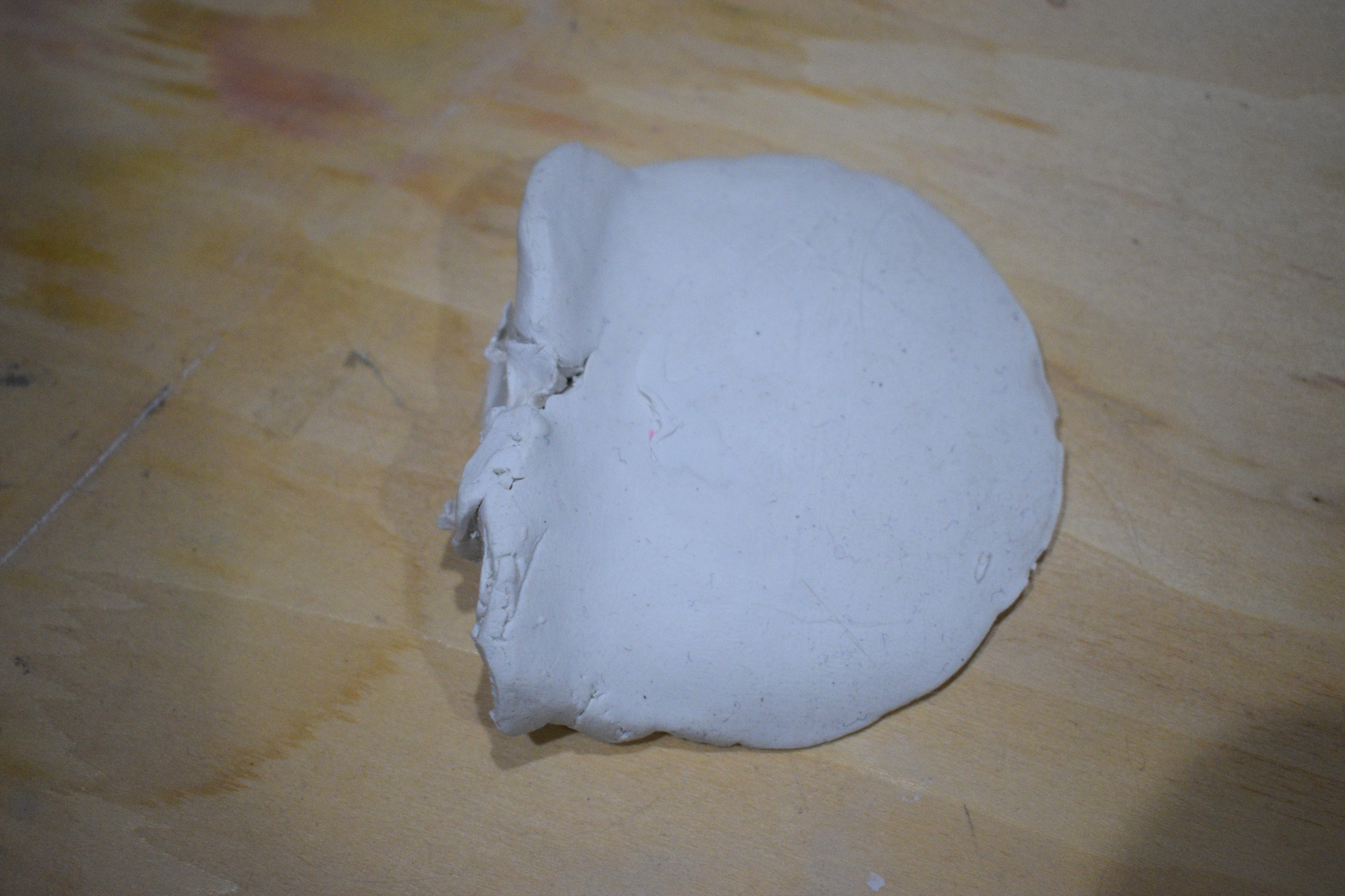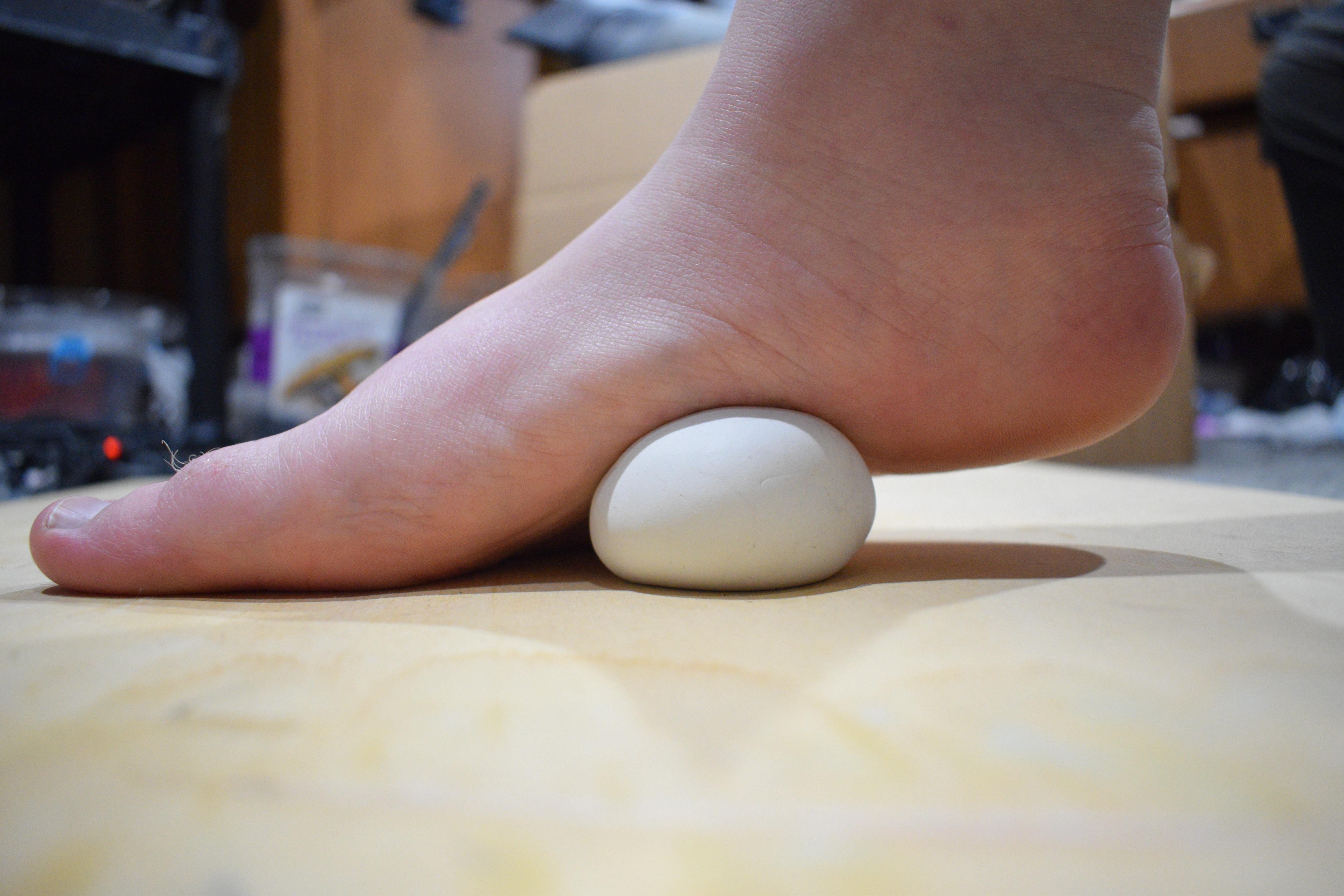 1: For making arch impressions, I used some sculpey clay from Walmart left over from a previous project. Taking enough to make about an 3inch ball, place the ball on a hard surface. Align the ball under the arch of the foot and step down. Stand straight for a few seconds and allow our body weight to distribute the clay/dough outwards and further under your foot.