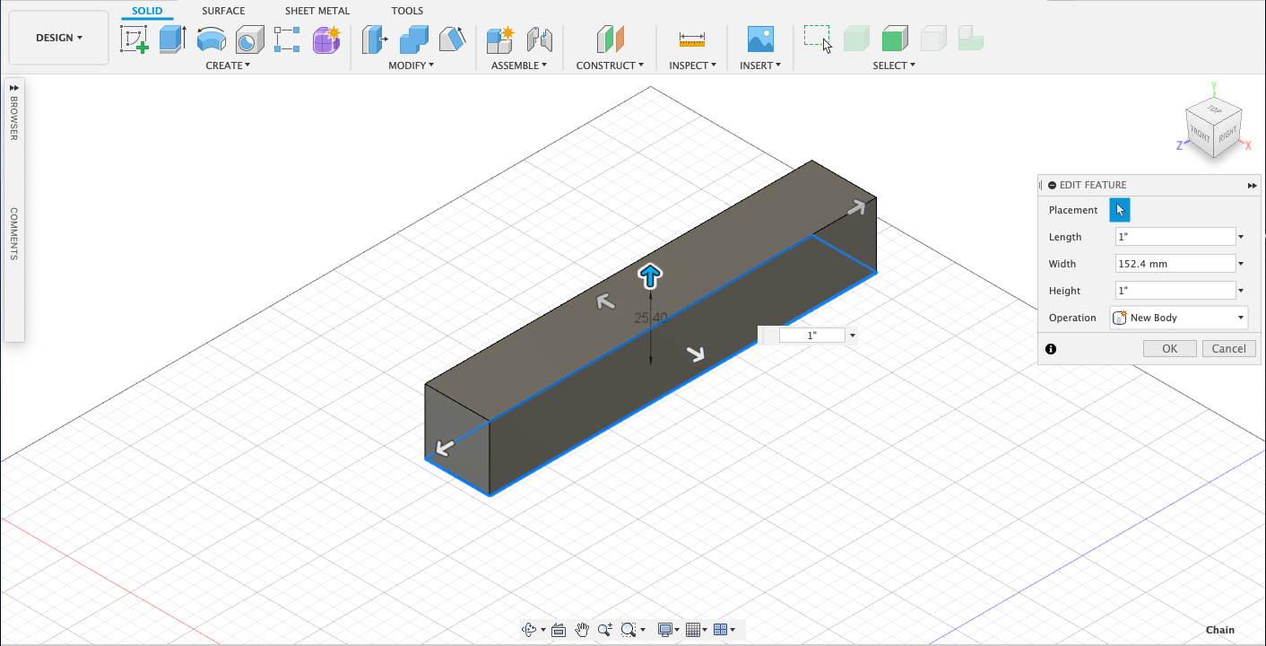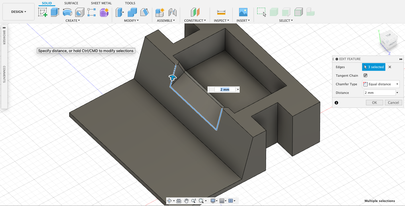 7. Using the Fillet tool (located under the Modify menu or shortcut F key), select edges to round out harsh edges. Set the fillet to about 0.25mm.