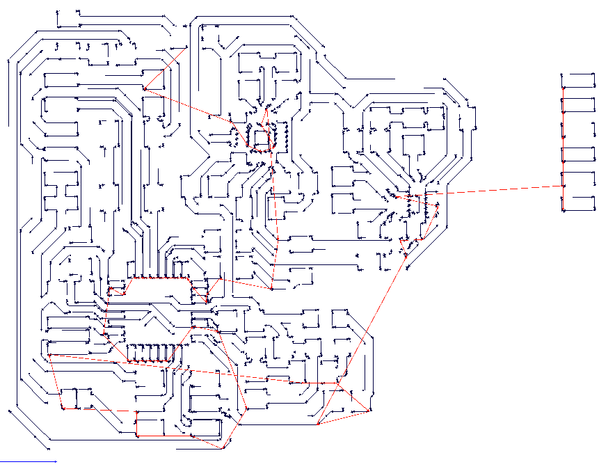 My finished board is shown above, it turned out great. There were some minor issues of course: there was one short circuit left over after milling that I had to remove with a razor blade, and a few of the orphaned leads to my Gyro chip popped off during milling - this shouldn't be too much of an issue. I also accidentally dug into one of my traces because I started a finishing path with the wrong x/y offset - be sure to double check these each time you run the Modela. (see images above)