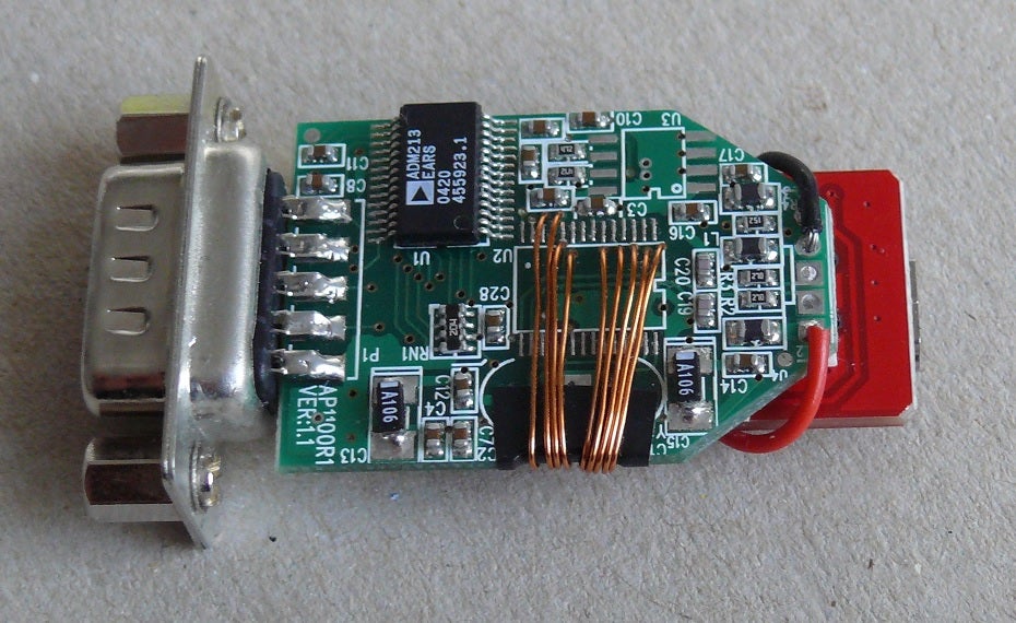 First I needed to find the serial connections. This was easy. I used the PL2303 data sheet to identify the relevant pins and followed the PCB tracks to find a convenient place to solder wires. In many cases there will be a βviaβ through the PCB. These will take fine enamel insulated wire.