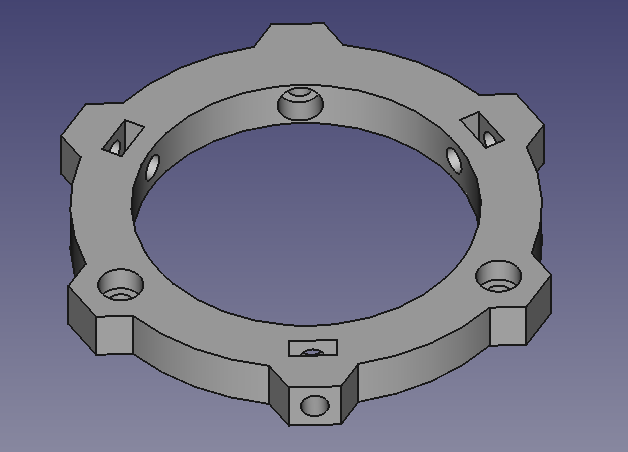 As can be seen, there are 6 holes for M3 bolts. Three M3 bolts are used can be used to secure a "ring" and tweak the position of whatever it holds. The there other holes can be used to mount the ringholder onto other objects, such as a "bar" or "horizontalbar" (see next step)