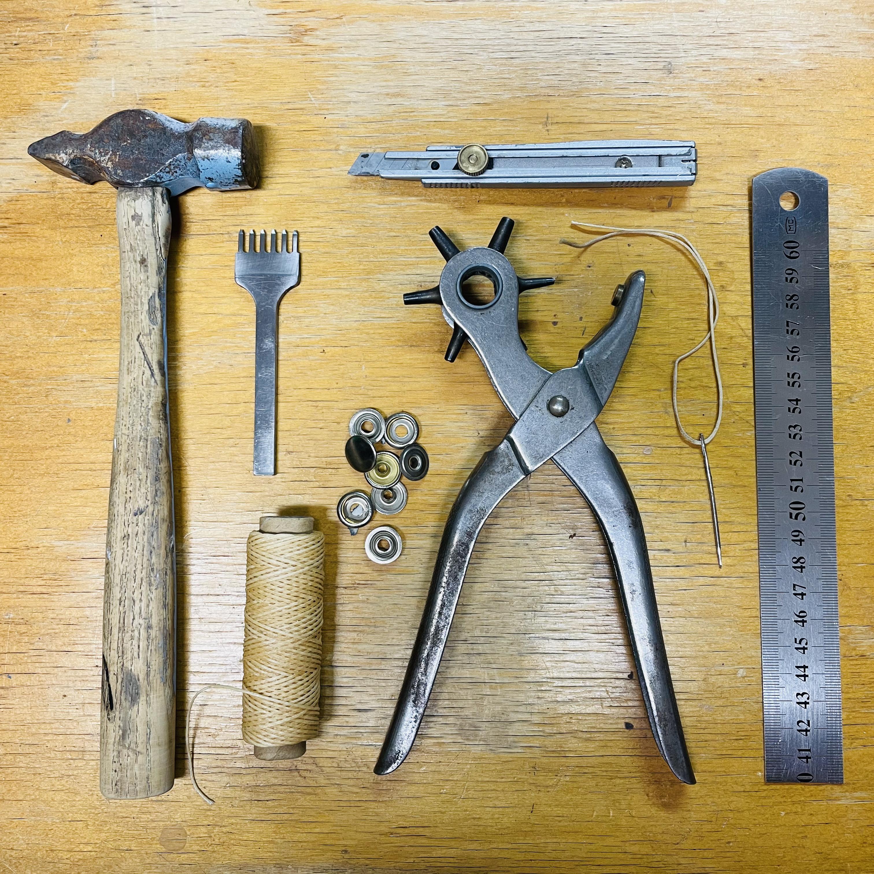Exacto knife / Hole puncher / Leather needle / Hammer / Metal ruler…