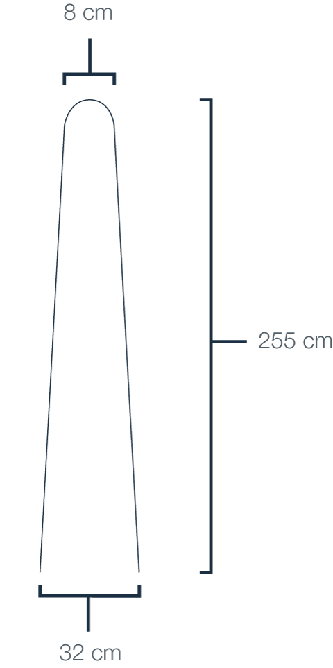| Once you have found a fabric which is suitable for this project. You will need a lot of it. Around 265cm in length, and 90cm in width if you want to re-create the exact same tentacle lamp. The pattern which I used is shown here. Is slightly cone shaped. Trying to emulate the shape of a tentacle. This shape adds more dynamic to the final form and it provides more surface at the bottom. Which can be exploited to create a wider, and therefor heavier, more stable foot. I drew the pattern directly onto the fabric, using a measuring tape and a black marker. But you could go all out fancy and cut a paper shape first. Or use a special fabric crayon. Most important is how you draw this shape the most easiest upon any surface. Whether it is on paper or textile. I drew 2 dots, 255cm apart from each other. Then I drew the two outlines on a 90 degrees angle. 8cm on one side, 32cm on the other. Using the 2 dots as the center point. Then using something long and (somewhat) straight to connect the dots together. Then I drew the same shape again. Normally I would just fold the fabric together. But with a pattern of this size. I would simply waste too much fabric. | ![]() |