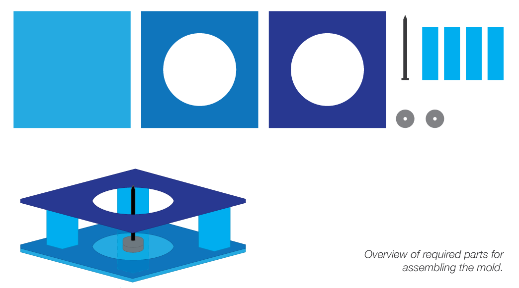 Besides the nail is everything made of wood. Assembling is just done with wood glue & screws. Use the image above as a reference of how the mold should look like. When you have assembled all the parts. The base for the mold is done. Now it needs to be sealed. For this I used a piece of transparent PVC (which just happen to have something printed on it, as you can see in the picture