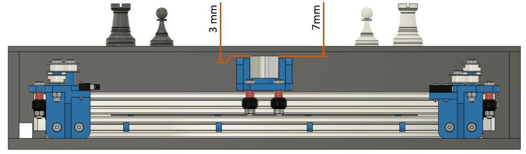 The trolley is assembled on the XY table. It is equipped with an electromagnet. The electromagnet can generate a magnetic field which creates the link between the trolley and the chess pieces. So, when the trolley moves the chess pieces follow it.