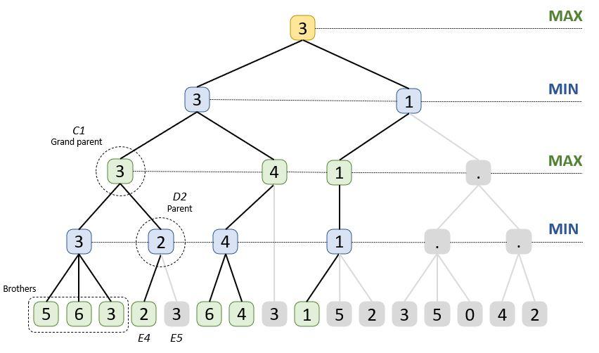 The brother of the position E5 is the position E4, they are in the same branch. Their parent D2 will select the Min, so if the position E5 is evaluated above 2, it will not be retained and if it is below 2, it will be retained. So, whatever the value of the position E5, we can be sure that the rating of D2 cannot be above 2.