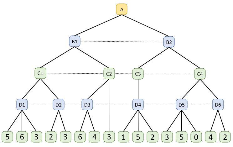 In addition, the grandparent C1 of the positions E4 and E5 is also the grandparent of the positions E1, E2, E3, and it will choose the Max of his two children D1 and D2.