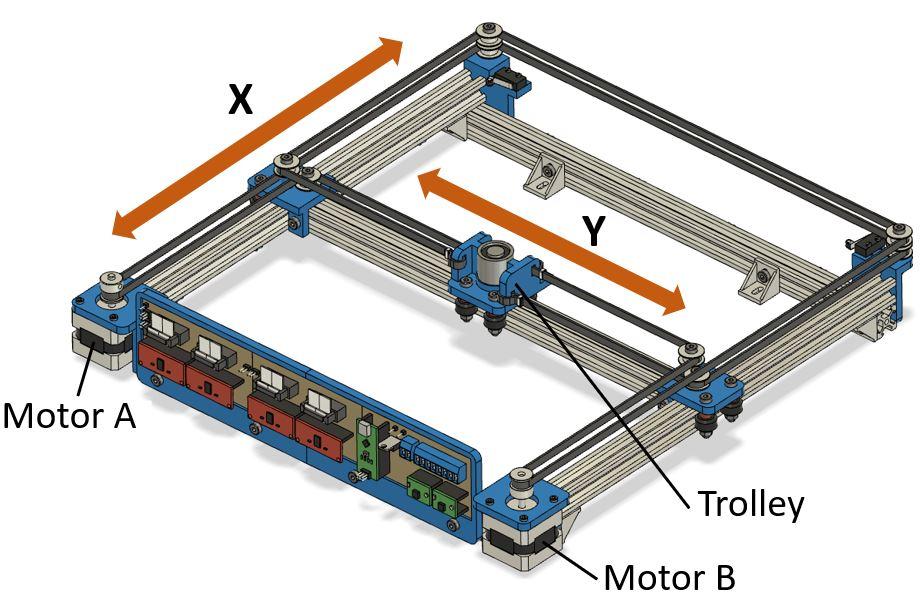 The trolley motorization is based on the Core XY concept. Two motors with two belts are used to move the trolley following the X and Y axes.