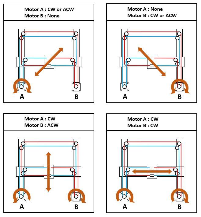 If only one motor turns a diagonal displacement will be generated. Changing the motor rotation direction will give an inverted displacement.