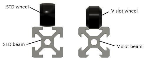 The guiding of the linear slides is based on the V-slot concept. The V-slot design uses standard aluminum profile with a V machining at the central grooves, to allow the centering of a specific wheels. The beam is acting like a linear rail when the wheel is seated into the V groove.