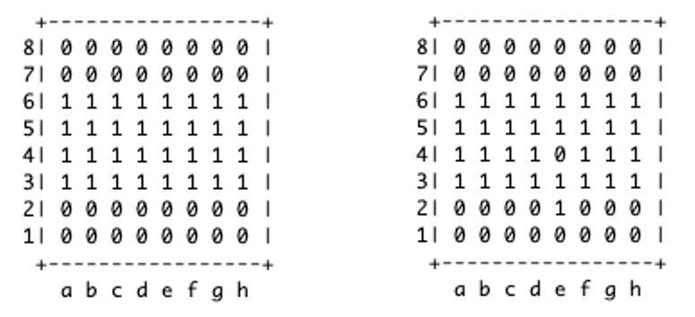 To determine the displacement of the human player, the code compares the status of the reed switches before and after the move. For the above example (e2e4), the reed switch mappings will display: