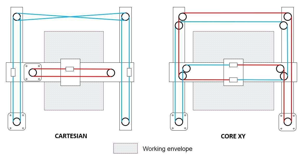 The main advantage of the Core XY concept compared to cartesian kinematics is to avoid having a motor on board the trolley beam. Thus, the horizontal beam is more compact and allow to have a bigger working envelope.