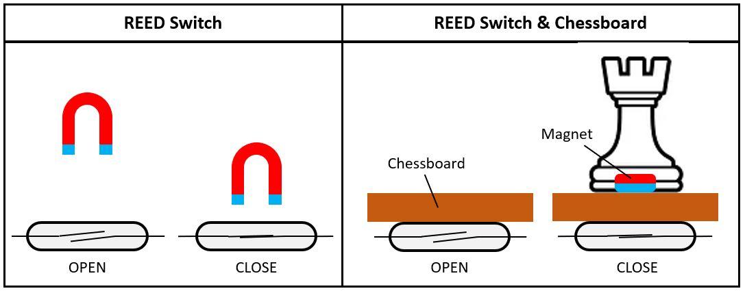 The reed switches are connected by means of the internal pull up of Arduino, it means that for the chess piece presence the sensor indicates 0 and 1 if there is no chess piece.