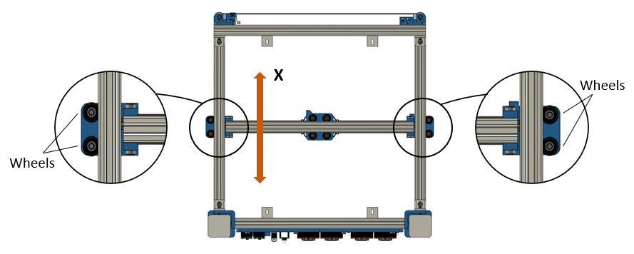 For the X displacement, the guiding is performed by means of 4 wheels, two at each extremity of the lateral beams.