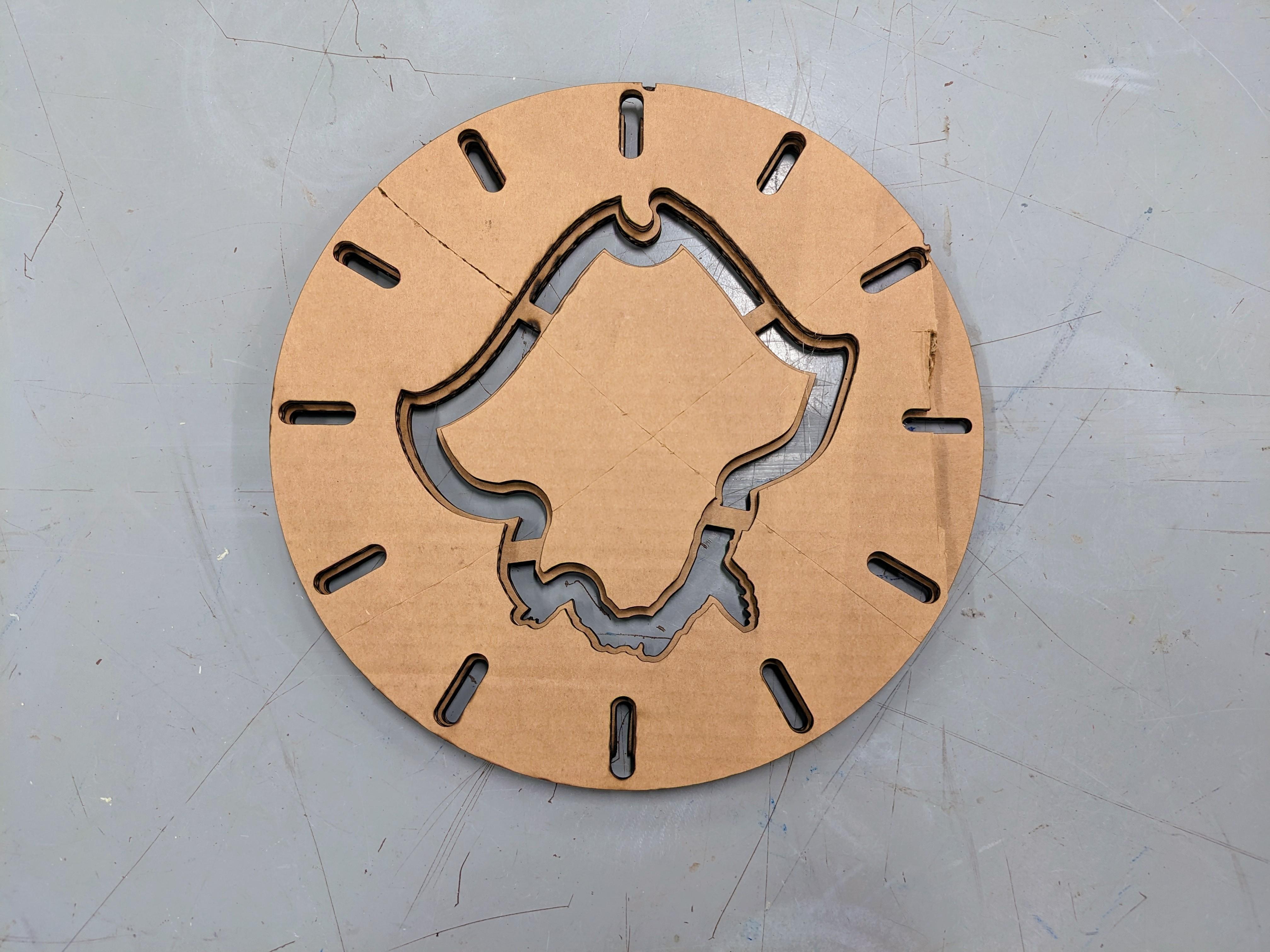 I always like to make an extremely cheap version of my designs before I move onto the more expensive material. In this case I used some corrugated cardboard to mock up the back of the clock and the two clock faces.