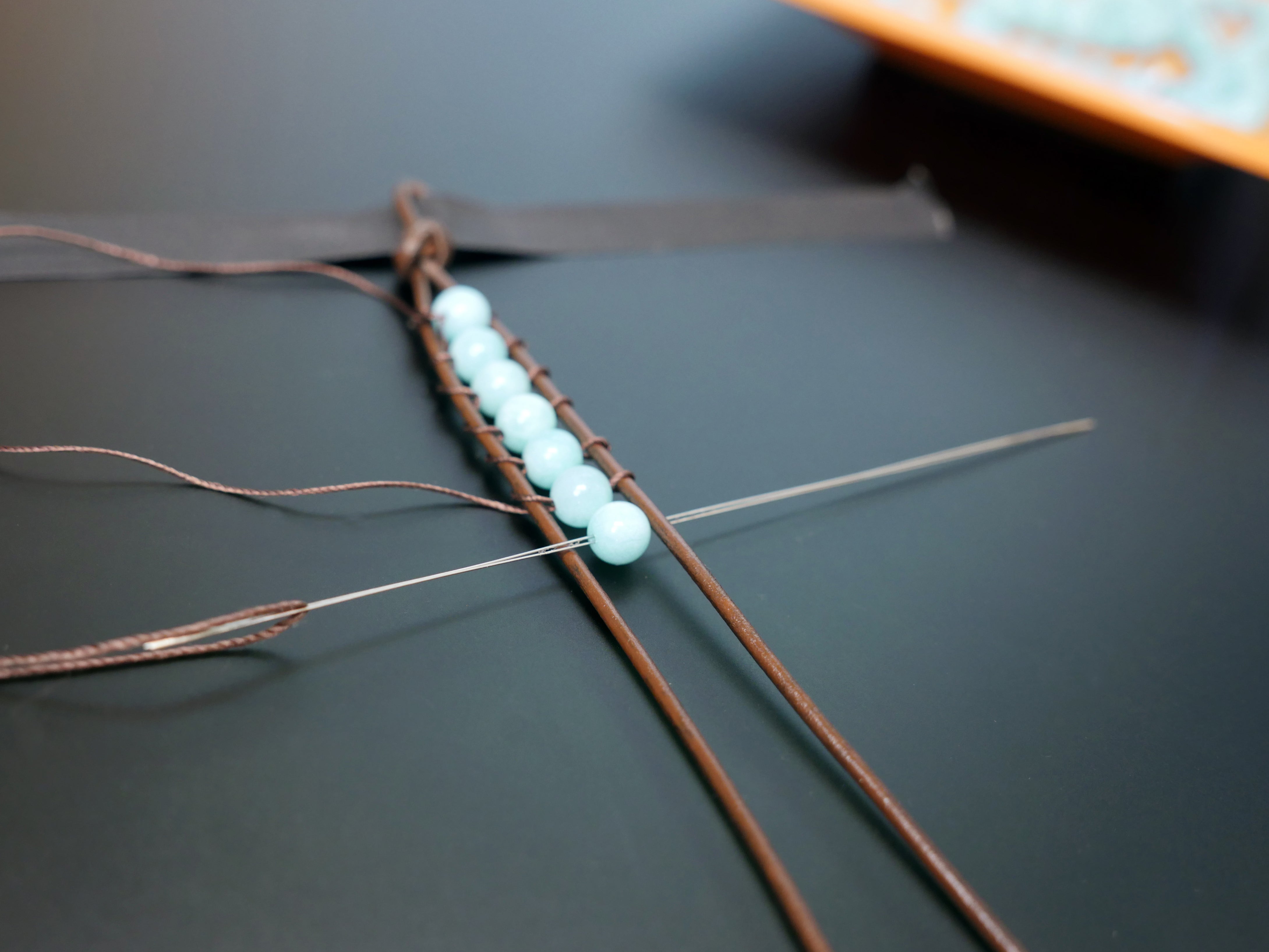 Thread the needle underneath the left cord and pull the beading cord all the way through until the bead is snugly secured between the two leather cords.