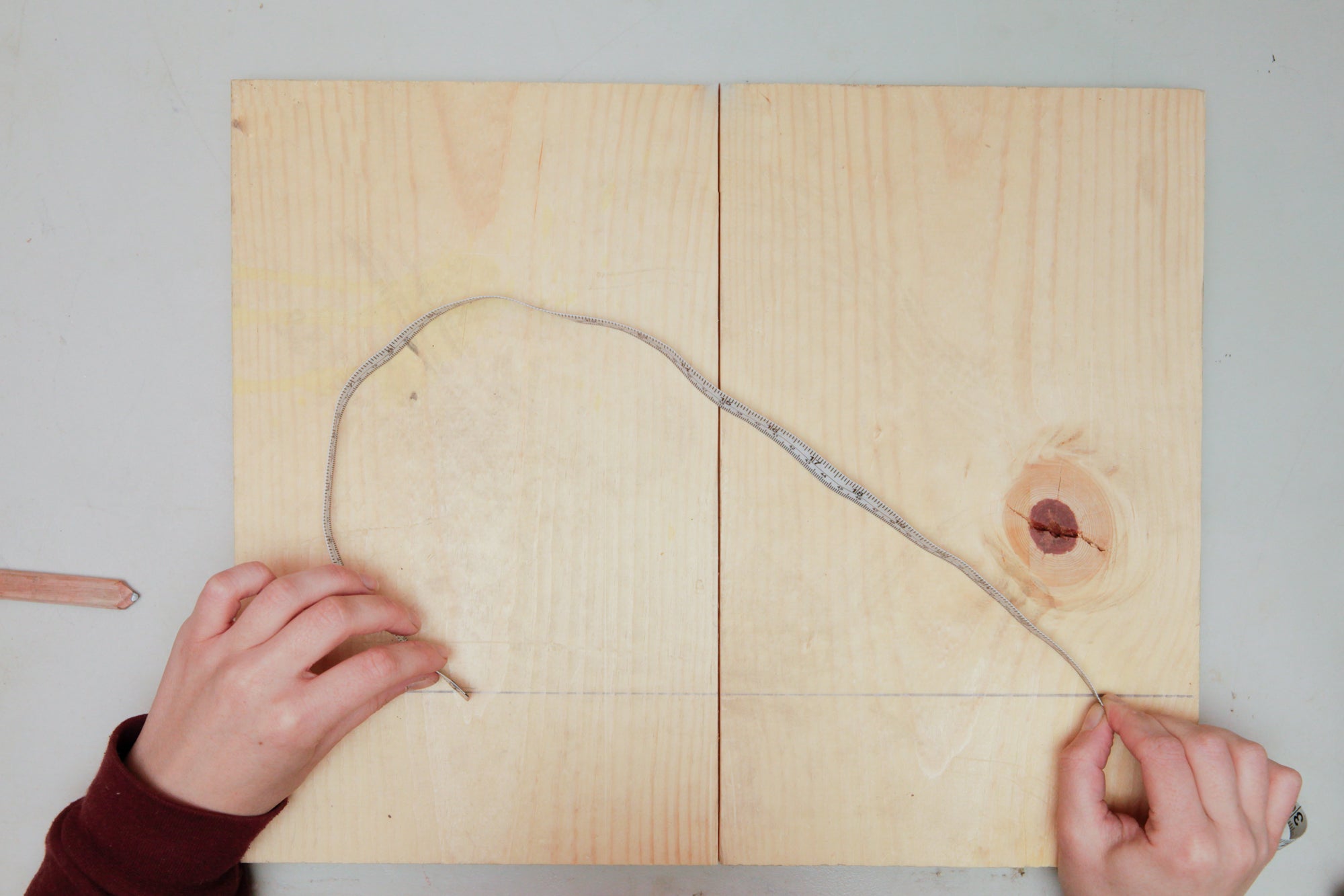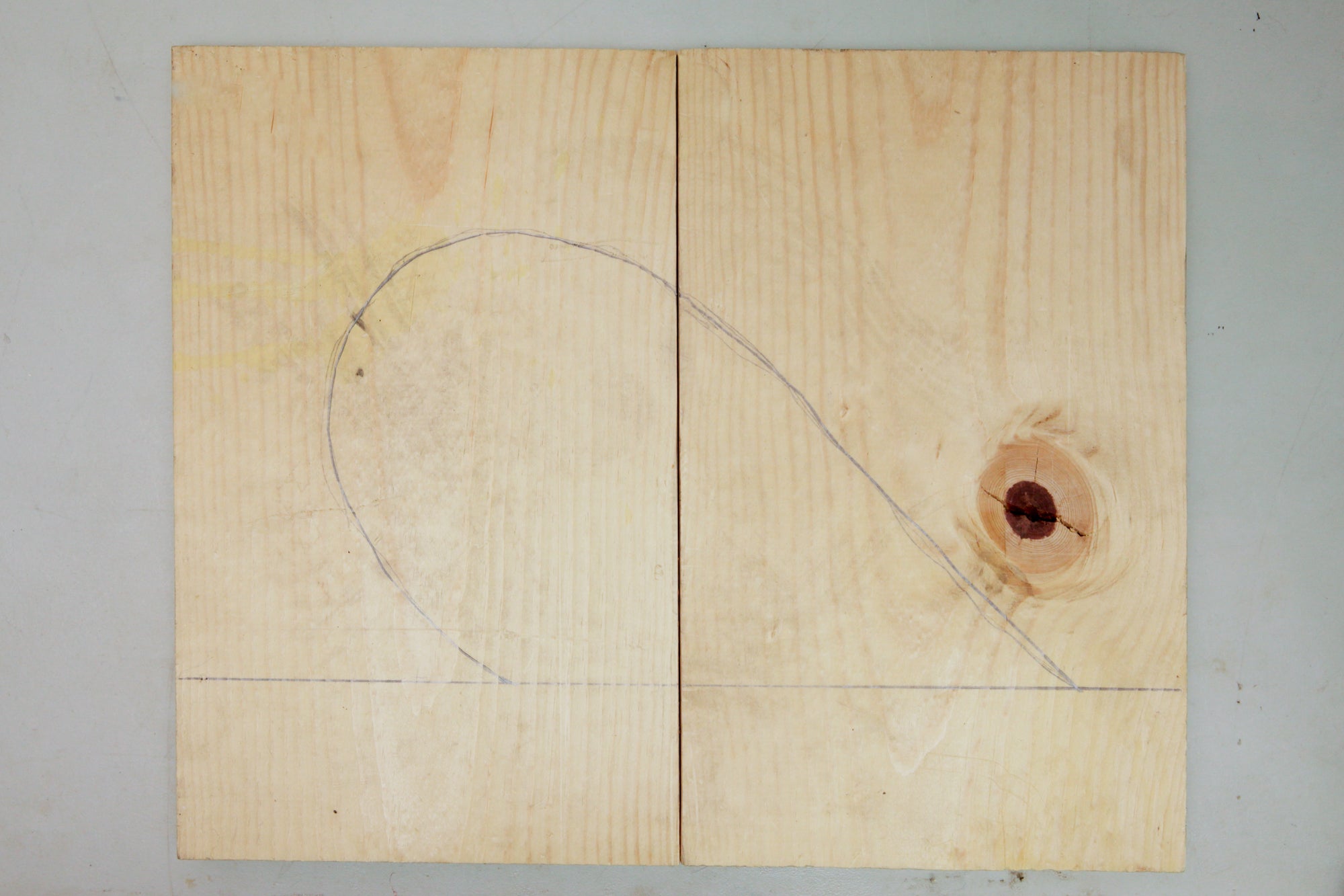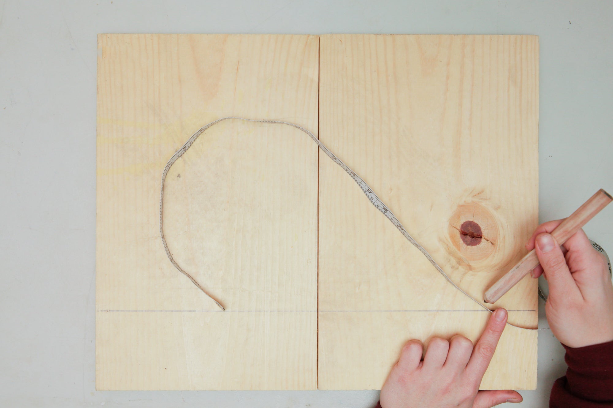 For this example project, I wanted to form a heart shape that is joined with two 90-degree pipe fittings. I needed to make two curves that were the same shape. To do this, I started by marking a straight line on a scrap board, this would be my mirror line.