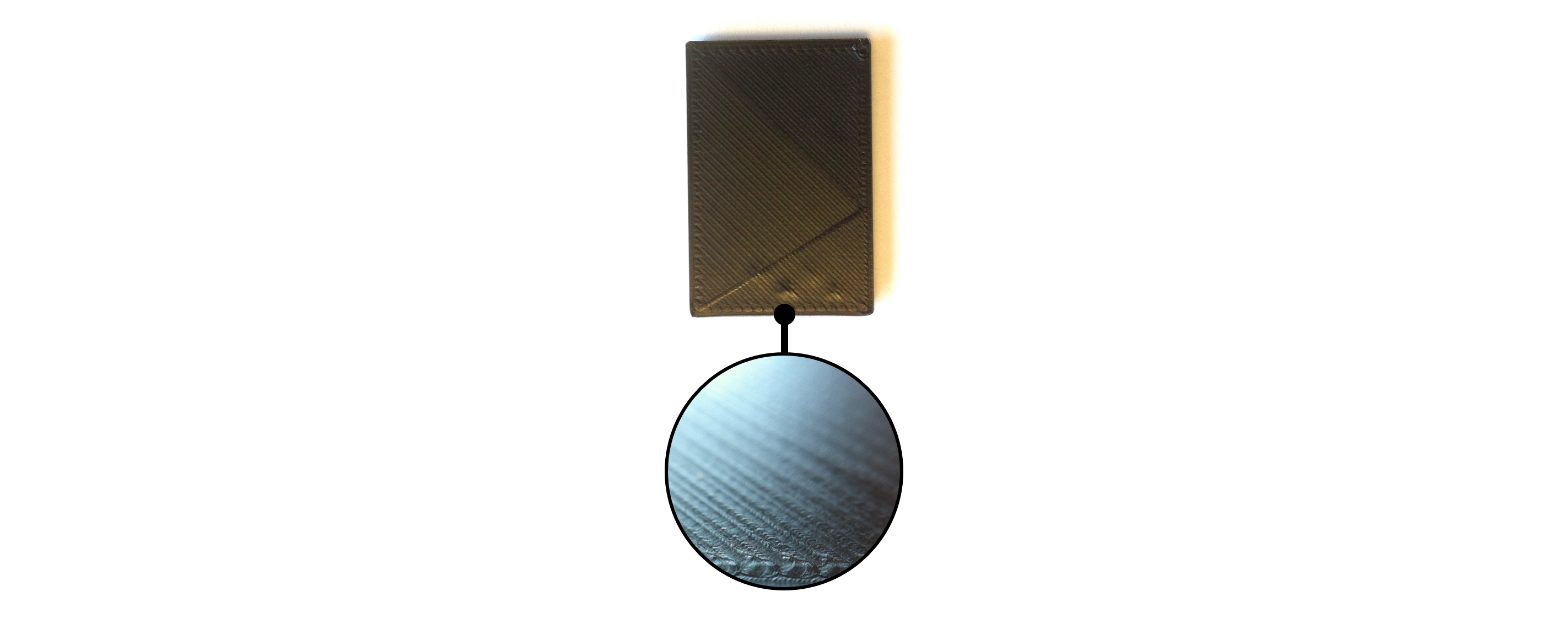 Of course to better compare all the objects, here is a reference you can refer to. It is a small rectangular piece (30mm x 20mm x 2mm). On the photo bellow you can see the upper face of the object, while the next steps are showing the lower face, in contact with the supports. And inside the black circle you can see the surface closer, with more details.