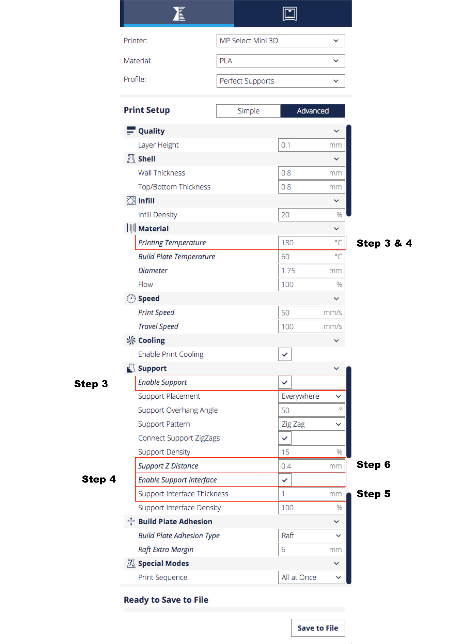- 3D printer used: MP Select Mini 3D