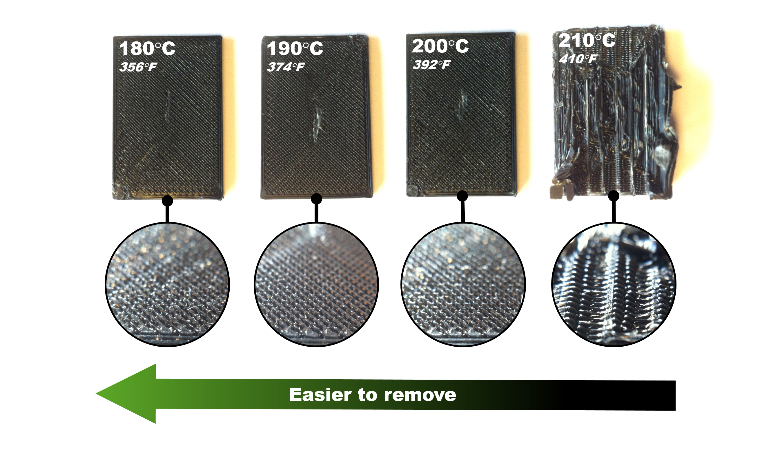 - However if the temperature is too high (210°C/410°F or higher), the support is sticking too much to the object and cannot be removed.
