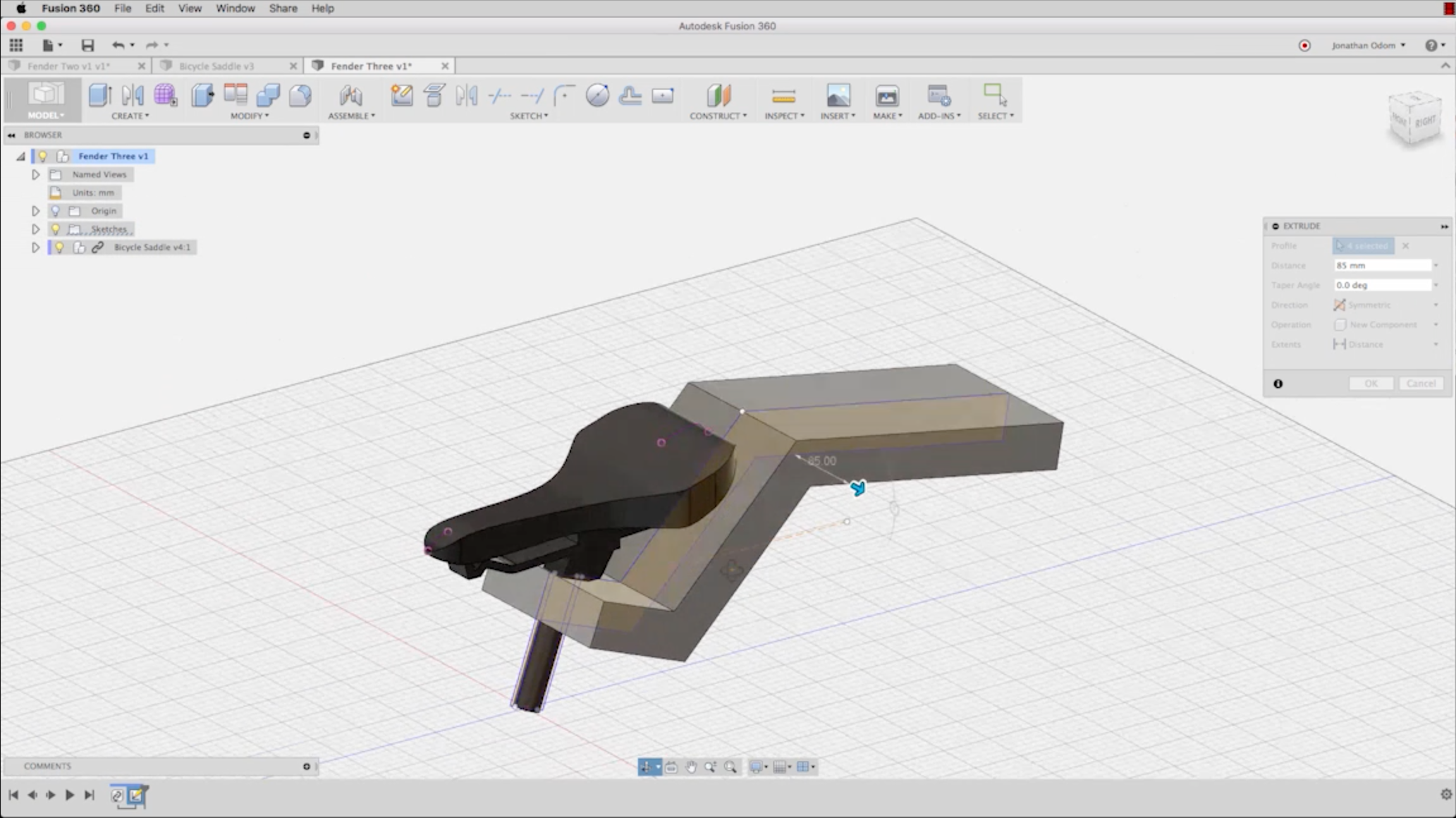 With my profile worked out, I use the extrude tool to make the base mass of my model. I choose Symmetrical for the direction and New Component for the operation. 85mm looks like a good number for the extents parameter.