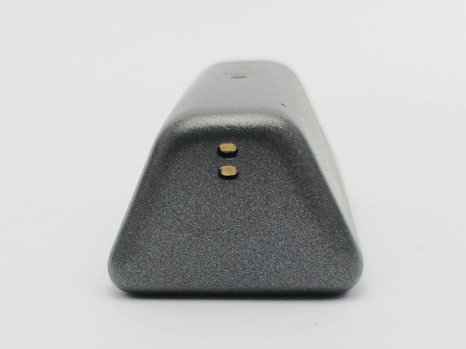 The two brass rods at the one end is the charging pads and the chrome pad on the opposite end is the capacitive touch pad.