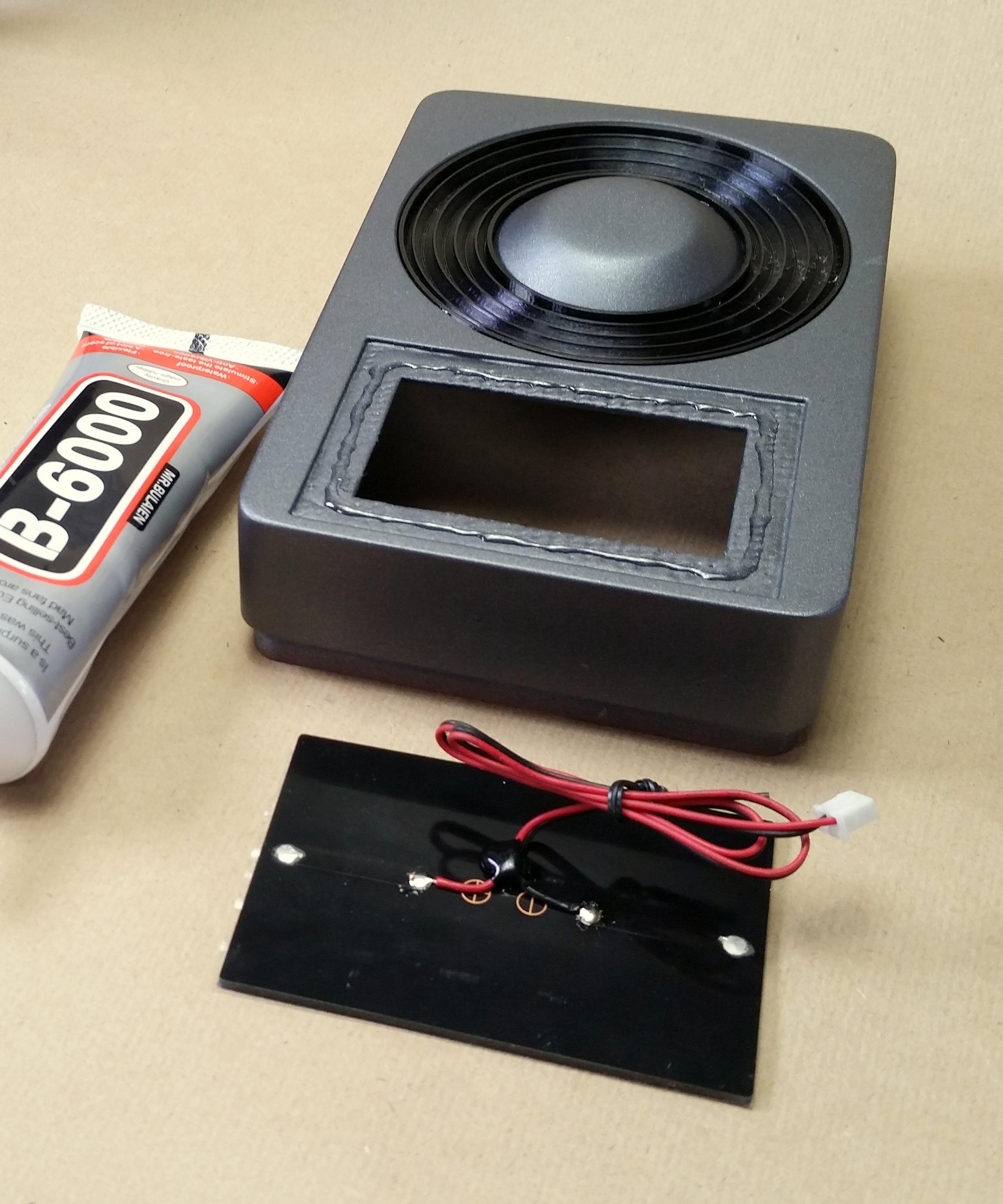The solar panel is a 60mm X 90mm 5V cell. Using the same B-6000 glue add a thick bead around the indent of the solar cell in the enclosures back frame and press the solar panel into place.