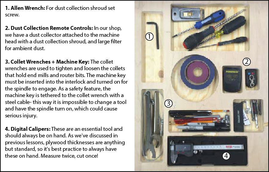 - SAFE CUTTING AREA: This must be considered when laying out the parts to be cut before tool paths are made. A 1" wide margin around the edges is usually enough to allow for the tool to cut without crashing into work holding.