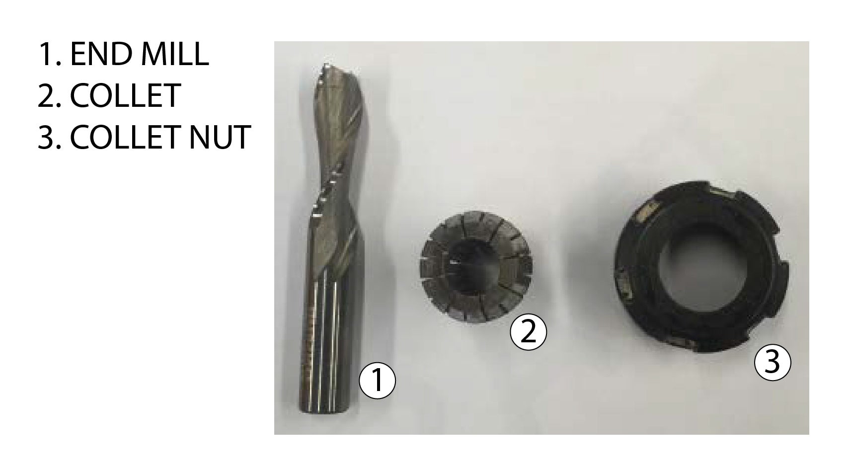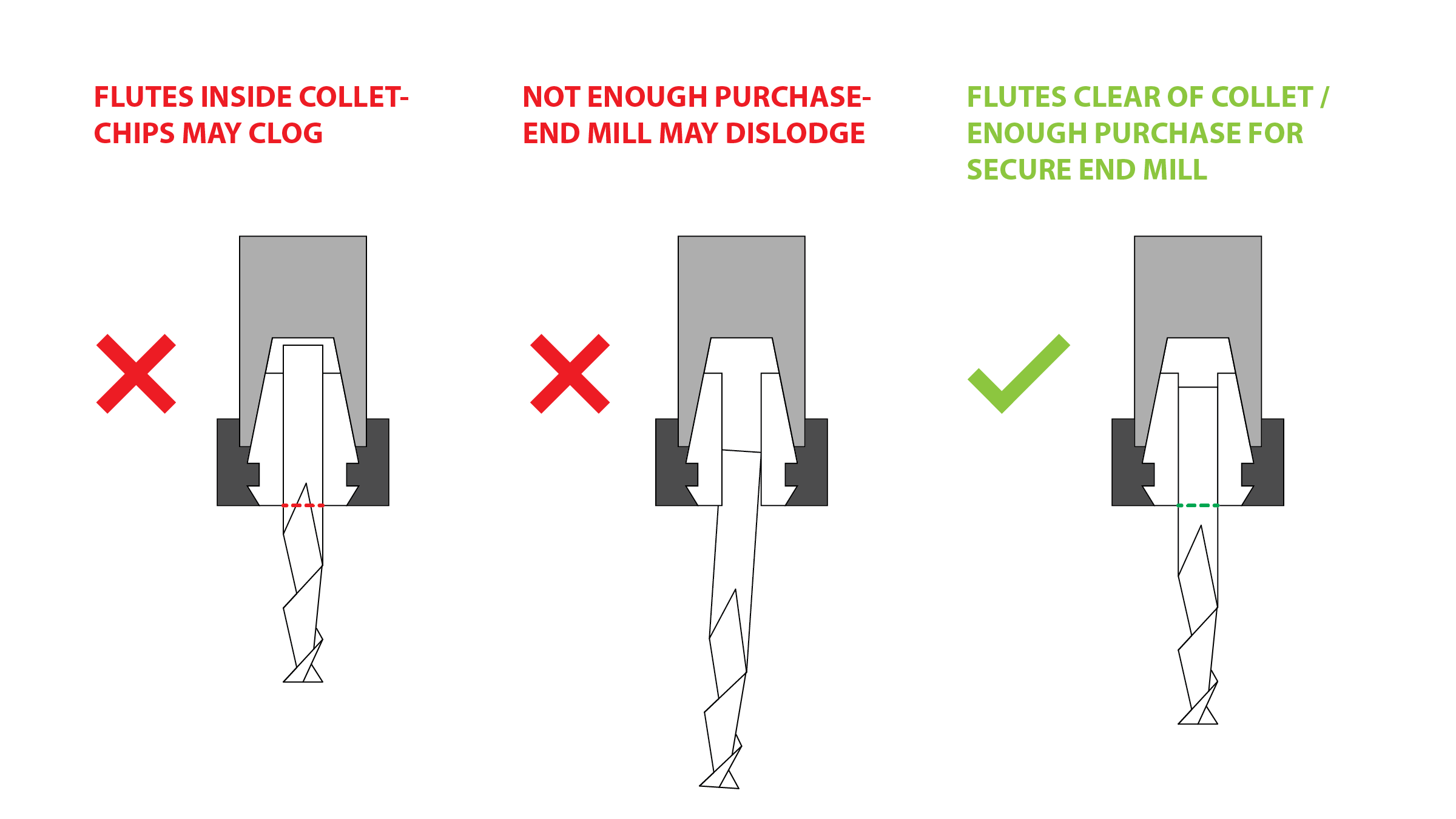 It's very important to ensure that the end mill is inserted into the collet at the proper depth. The flutes must be completely exposed to avoid clogging, but the shaft must have the maximum possible length inserted into the collet to avoid dislodging.