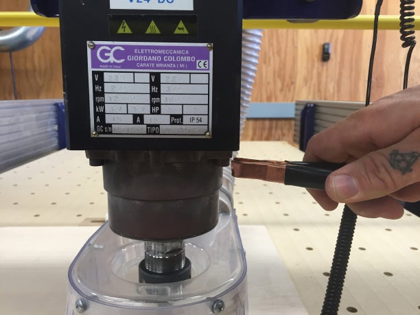 We have a dust shroud installed on our Shopbot. To access the spindle, use the Allen key on the bolt near the top of the spindle to lower the dust collector shroud so you can access the spindle.