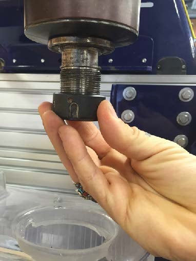 Next, insert the end mill to the proper depth, then tighten the nut against the spindle. Don't go too tight! If the collet it too tight you risk damaging the spindle threads and making it very difficult to remove the nut later.