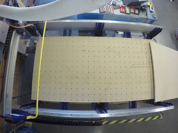 - Put your material down on the Shopbot table. On one side, choose two holes near the material that are a few inches apart. Blow debris out with compressed air.