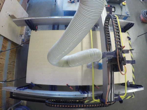 The Shopbot is controlled by a PC that is permanently plugged into the machine as it runs a toolpath. The Shopbot control software can run toolpaths, move the gantry manually, home the axes, run surfacing operations, and simulate tool paths among other things.