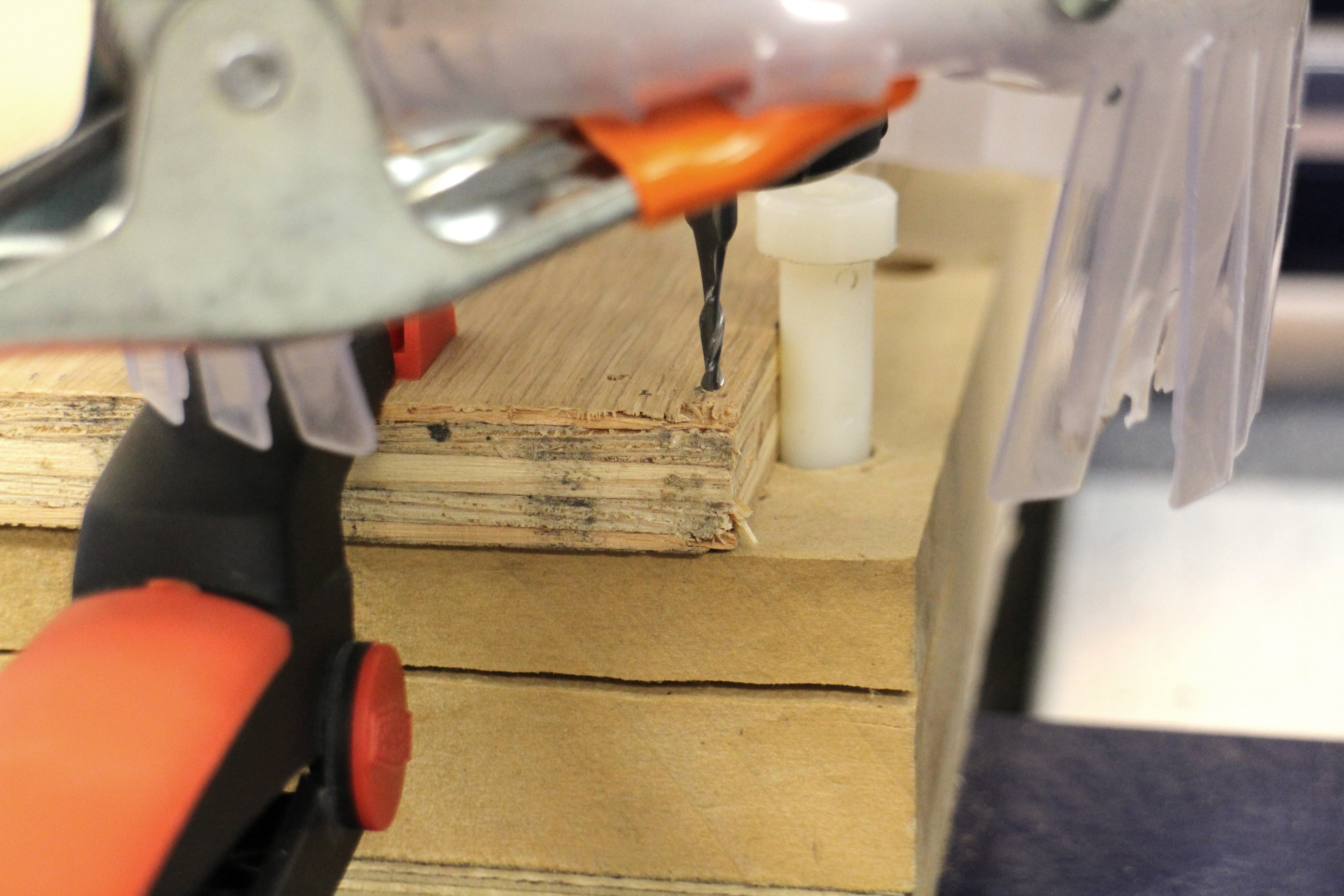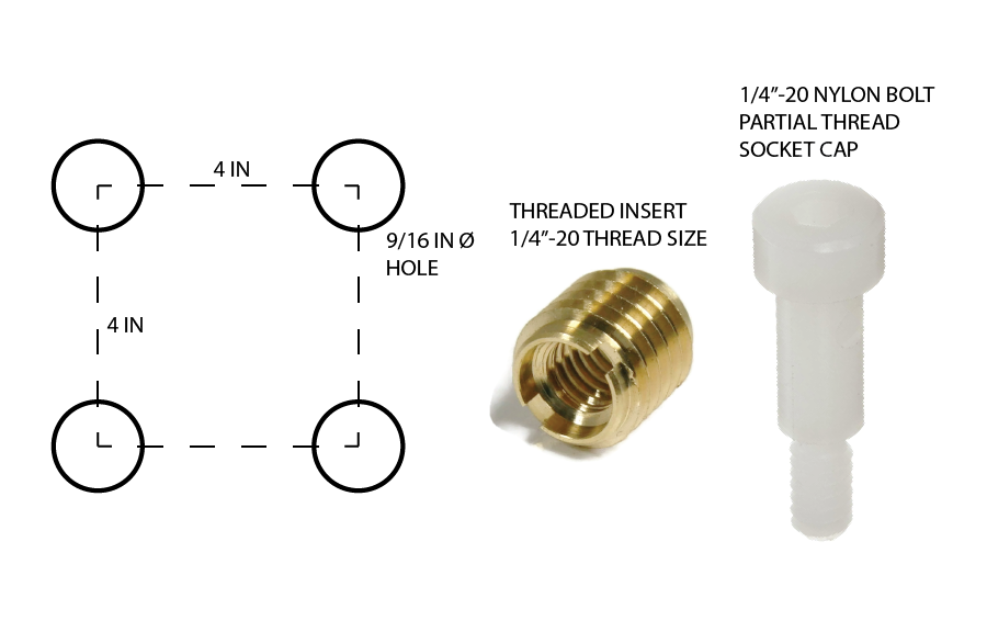 9/16" Ø holes are drilled by the Shopbot on a 4" X 4" grid, and 1/4"-20 thread size threaded inserts are screwed into the holes. 1/4"-20 nylon bolts are used to screw into the threaded inserts in conjunction with slotted blocks.