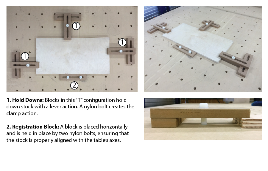 On one side, bolt down a registration block to ensure the stock is properly aligned with the Shopbot Axes. Then use hold downs on the other three sides to keep your material from pulling up.