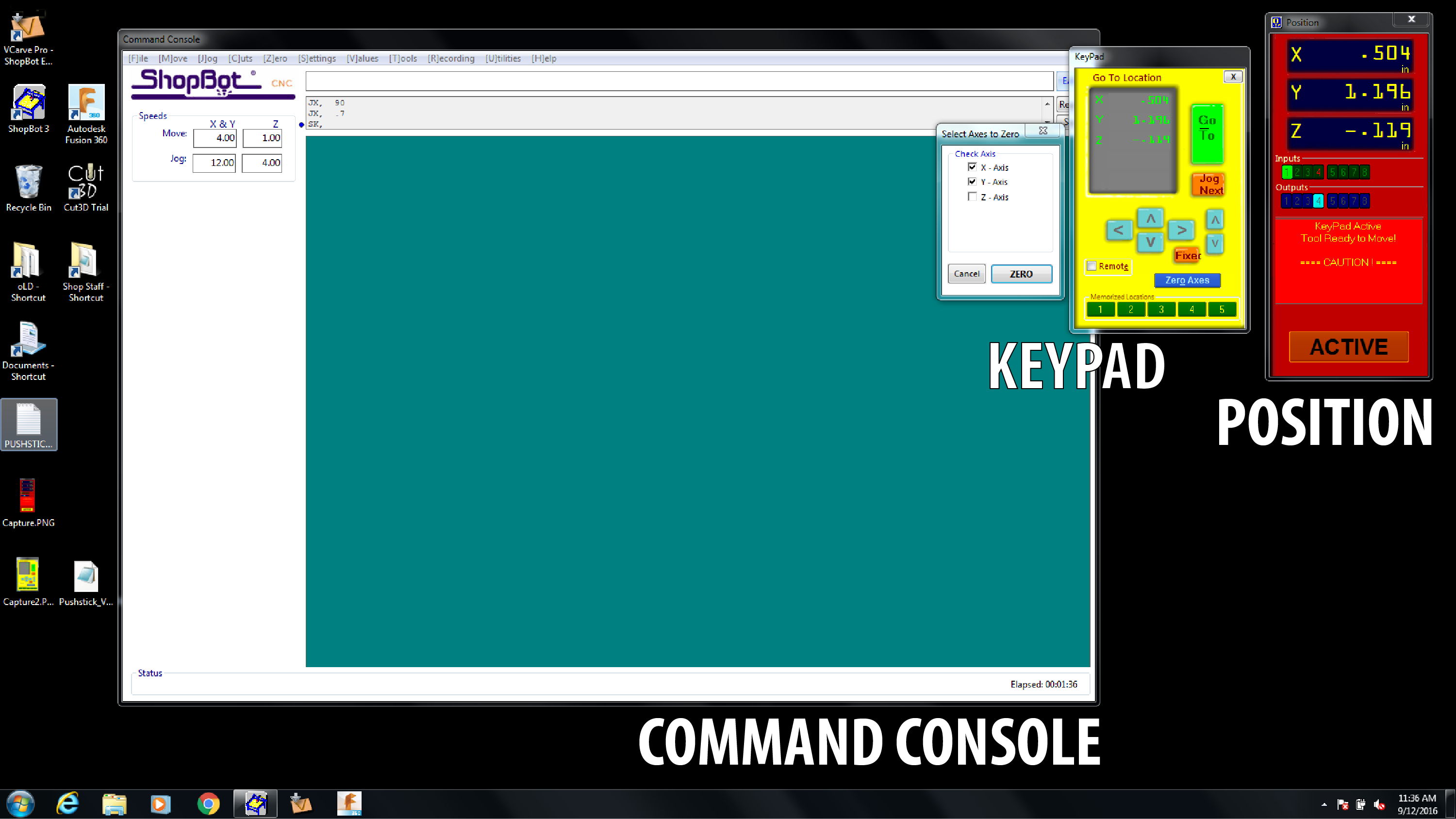 There are two windows that control the ShopBot: Command Console and the Position dialog box.