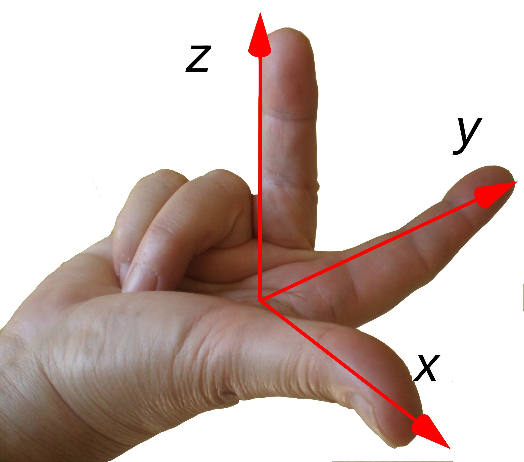 Right Hand Rule: To be sure which axis is which, just follow the "right hand rule". With your right hand, make an L shape with you thumb and forefinger, then point your middle finger up. The axes are X, Y, and Z counting down from your thumb. Remember that Z should be up.