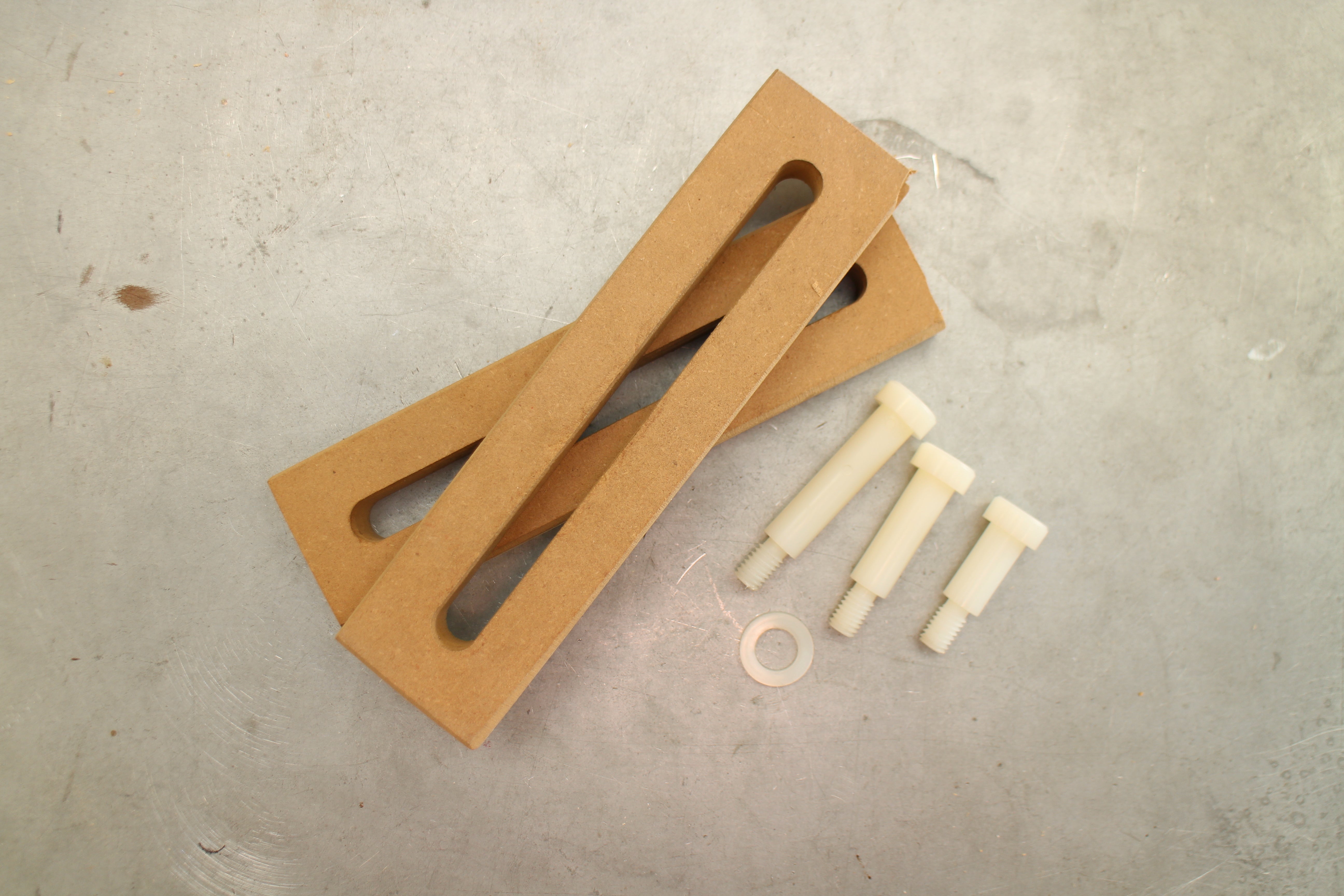 - Place a hold down block flat on the table, with the long edge flush against your material. Then screw the hold down block to the table with two nylon bolts, starting by hand and tightening with a wrench. Be careful not to overtighten more than ¼ turn so you don’t destroy the threads.