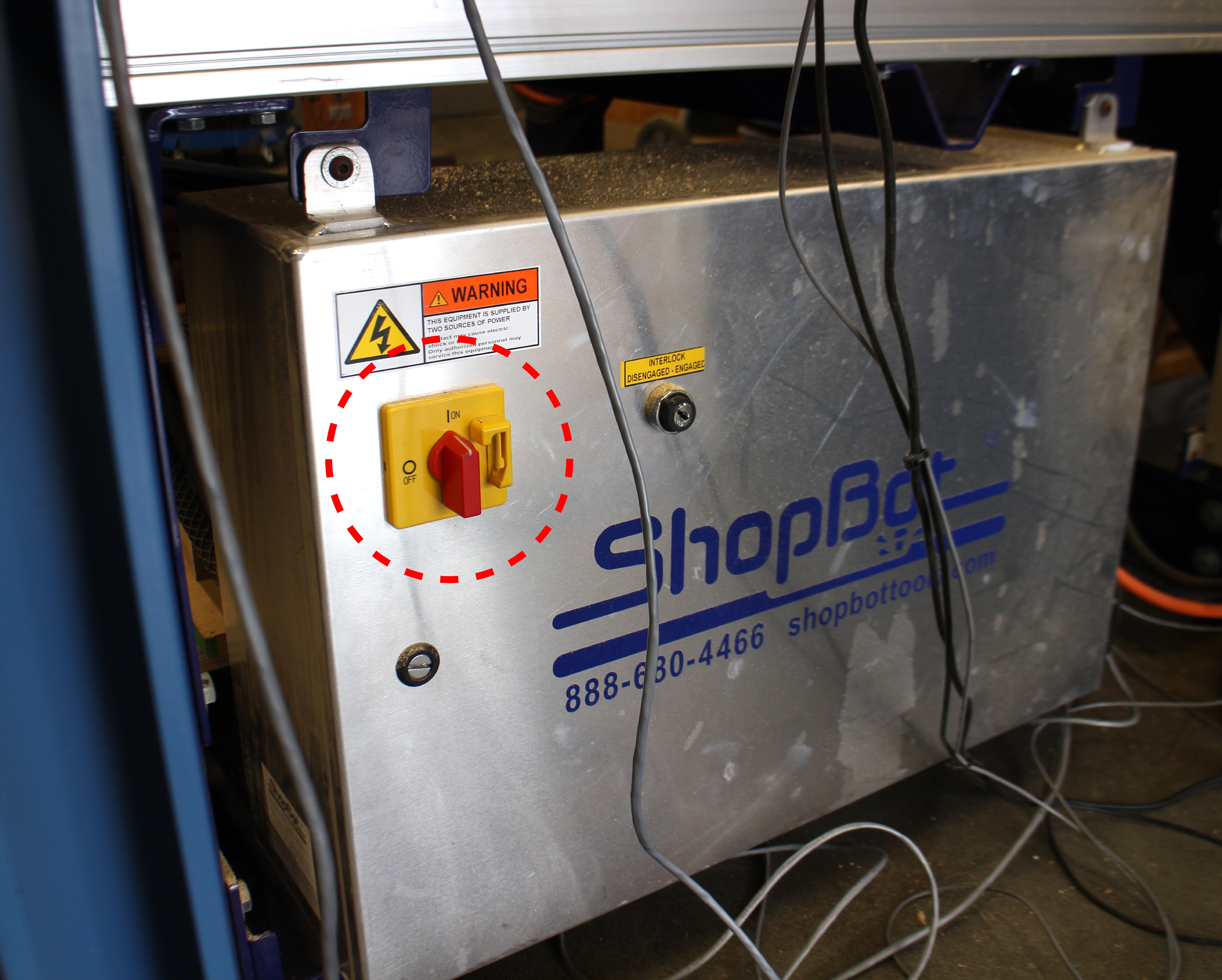 CNC routers may do unexpected things! There are two ways to stop the Shopbot quickly.