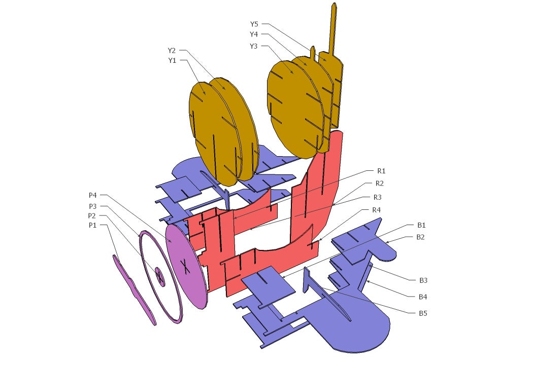 The design was exported to DraftSight as flattened 2D shapes. In DraftSight the components were laid out onto sheets that would fit in the laser cutter (20" x 32"). Once all the components were laid out, the sheets were cut down to the minimum size required. Duplicate lines were then deleted for any components that were touching one another.