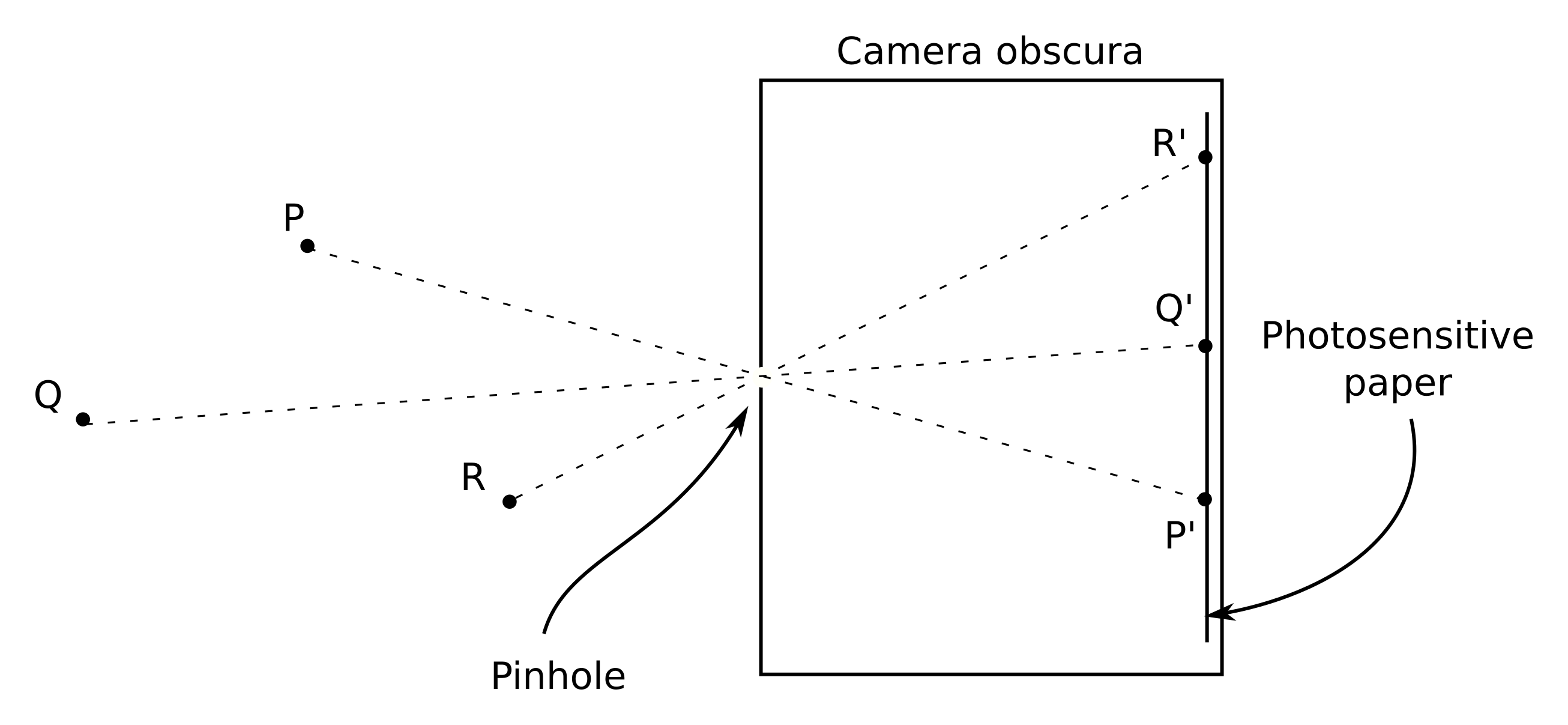 Fig.1 - Schematic of a pinhole camera. Points P,Q and R are imaged through a pinhole on a sheet of photographic paper as the points P',Q' and R'.