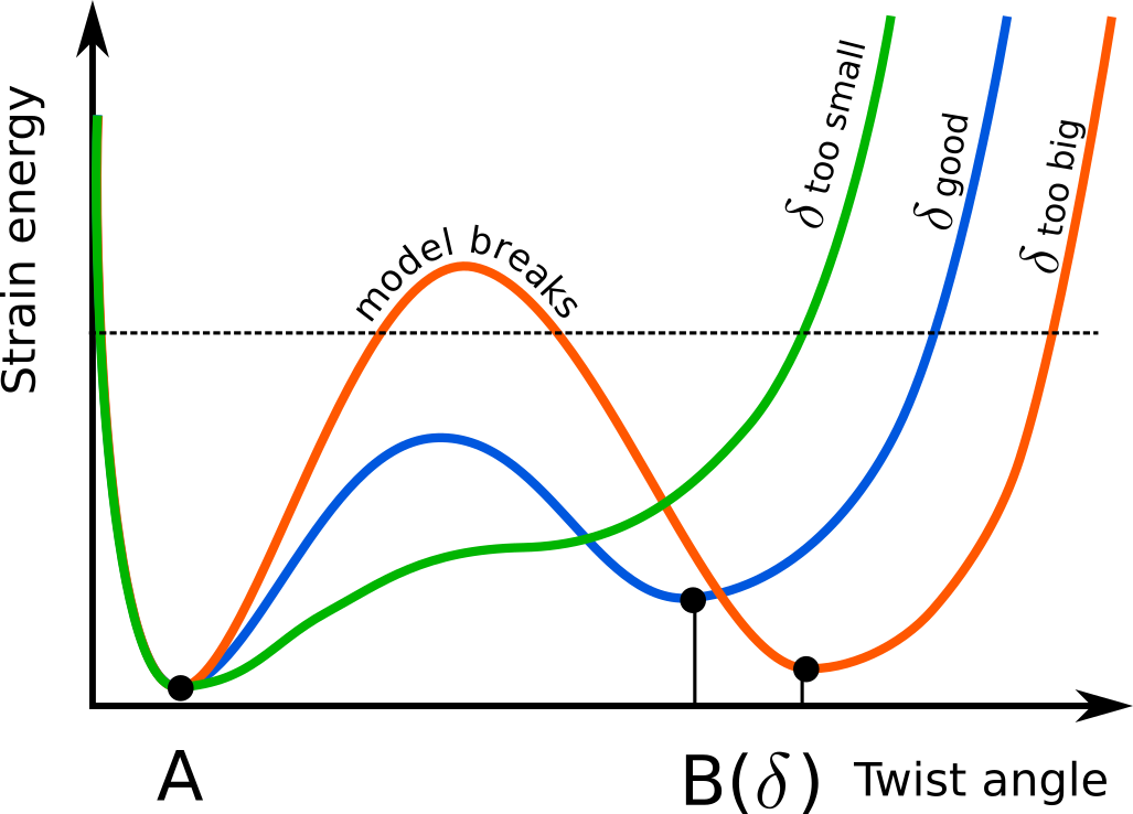 It turns out this angle δ has a big influence on this "bump" in energy required to go from one configuration to another. If δ is too small, the bump disappears and there is only one stable configuration. The origami structure behaves as a spring.