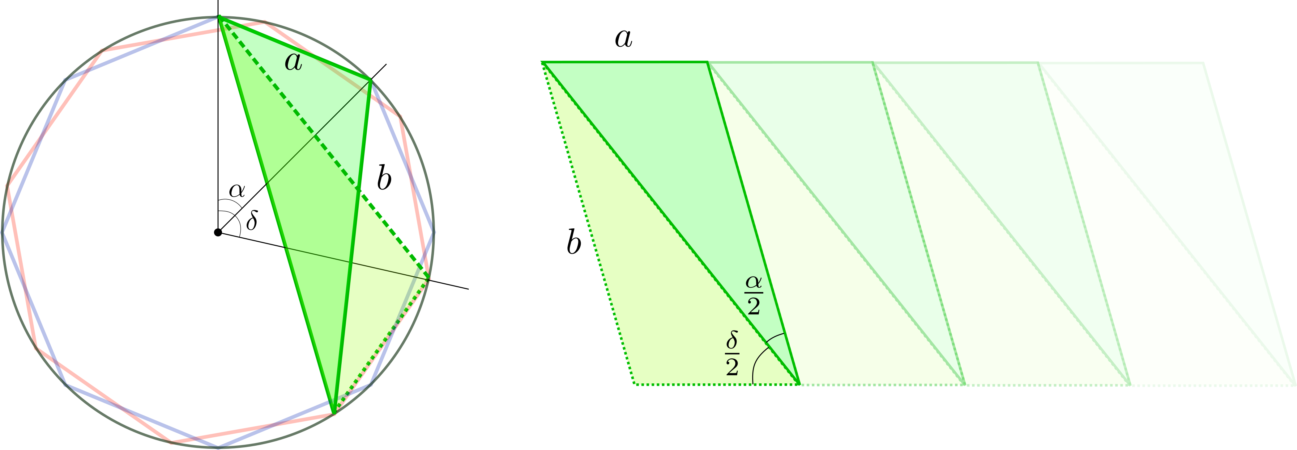Fig.2 - Schematic of two octagons with side length "a" rotated an angle δ with respect to ech other. On the right one can find the accompanying triangles with sides a and b, and angles 𝛼/2 and δ/ 2to construct the cylindrical triangulated origami.