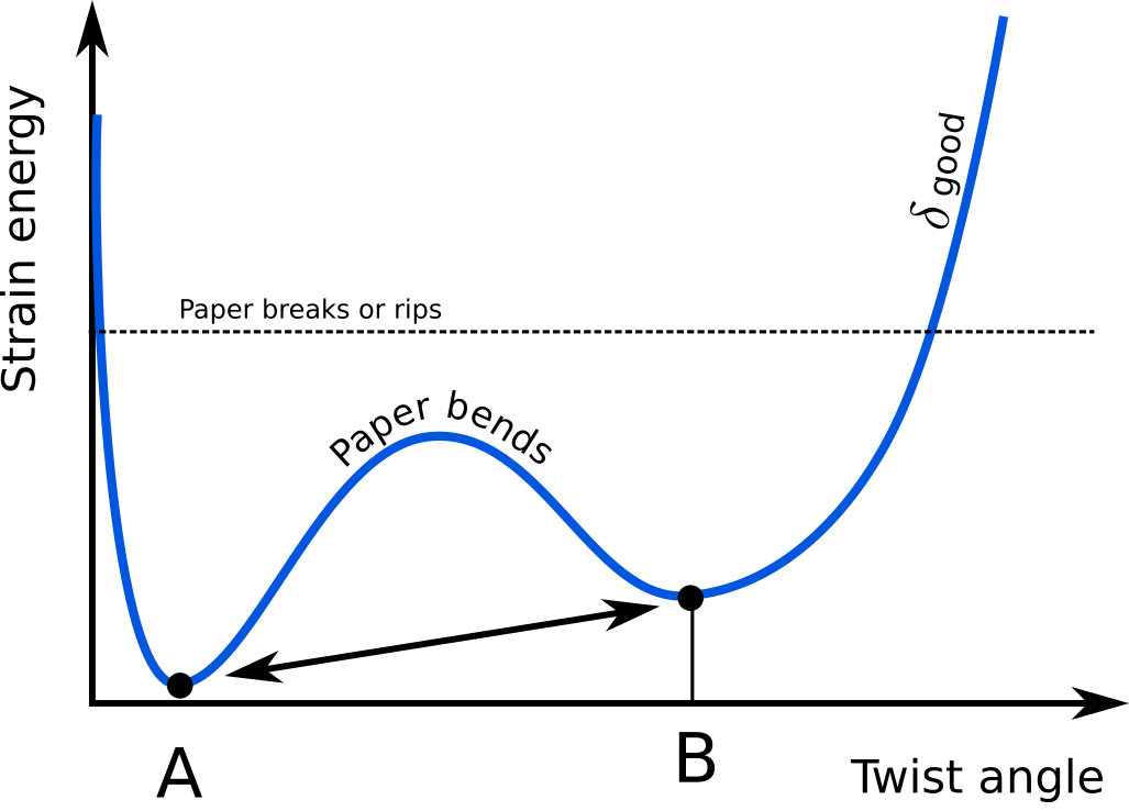 Fig.3 - To go from a flat state A to a flat state B one must overcome a small energy bump caused by the bending of paper. At some threshold the paper breaks.